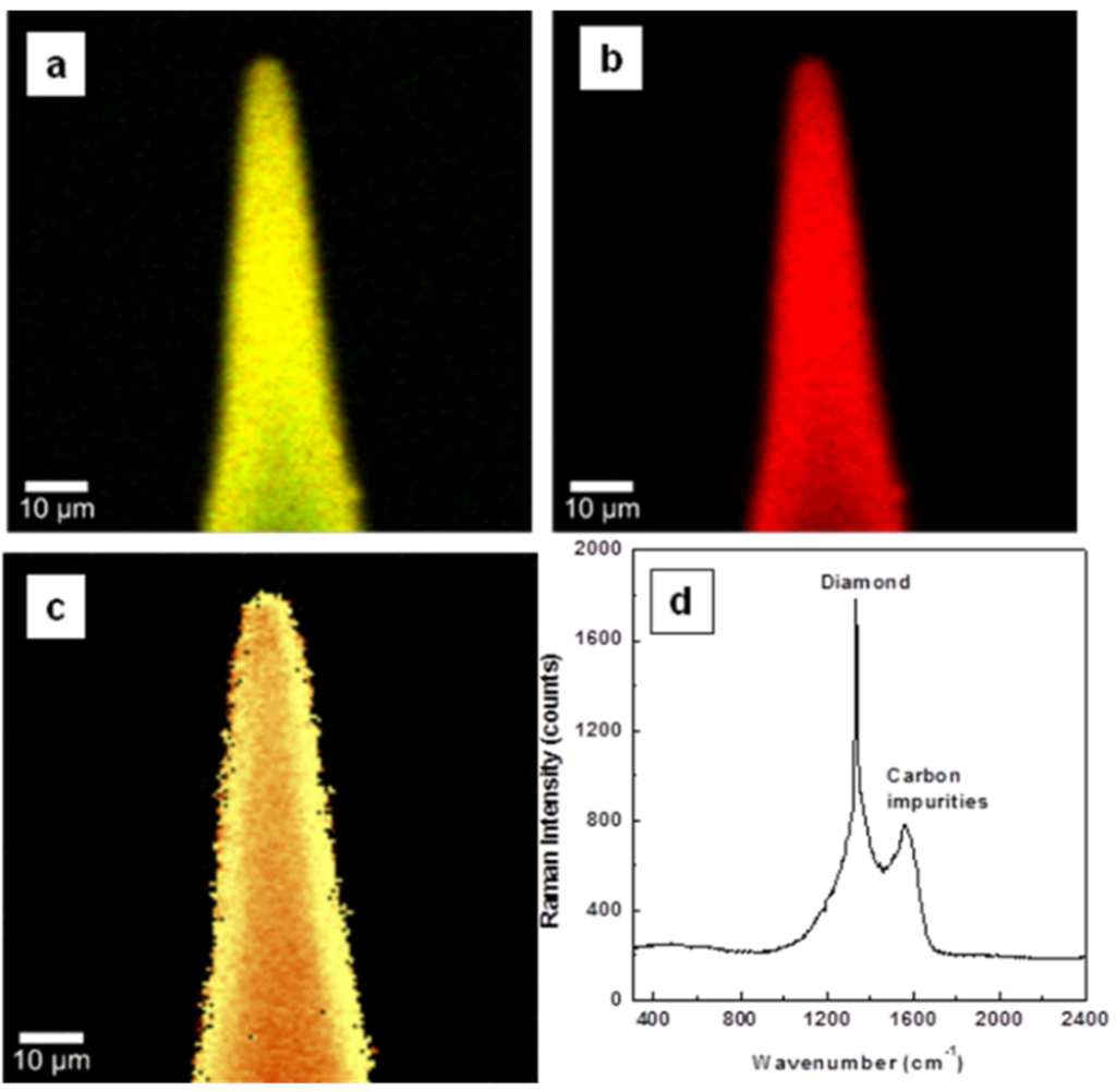The confocal Raman measurements were acquired at ambient conditions, in a backscattering geometry, with an alpha 300R WITec system (WITec GmbH, Ulm, Germany) using the 532 nm excitation of a frequency-doubled Nd:YAG laser. While 100X/numerical aperture (NA) of 0.90 and 50X/NA of 0.75 objective lenses were used for side-wall measurements of BDD films, to reduce the optical effects of the inherent curvature of the tungsten rods, a 20X/NA of 0.40 objective lens was used for acquiring such data on the surfaces of the films. An array of 150 × 150 Raman spectra were recorded for all Raman images with an integration time of 50 ms/spectrum. All the surface Raman mapping images were acquired with 85 µm × 85 µm scan sizes. Appropriate scan size dimensions, dependent on film thickness, were considered for side-wall maps, while maintaining a similar scale-bar in these images. Also, for these measurements, the samples were cross-sectionally cleaved along their diameters.
