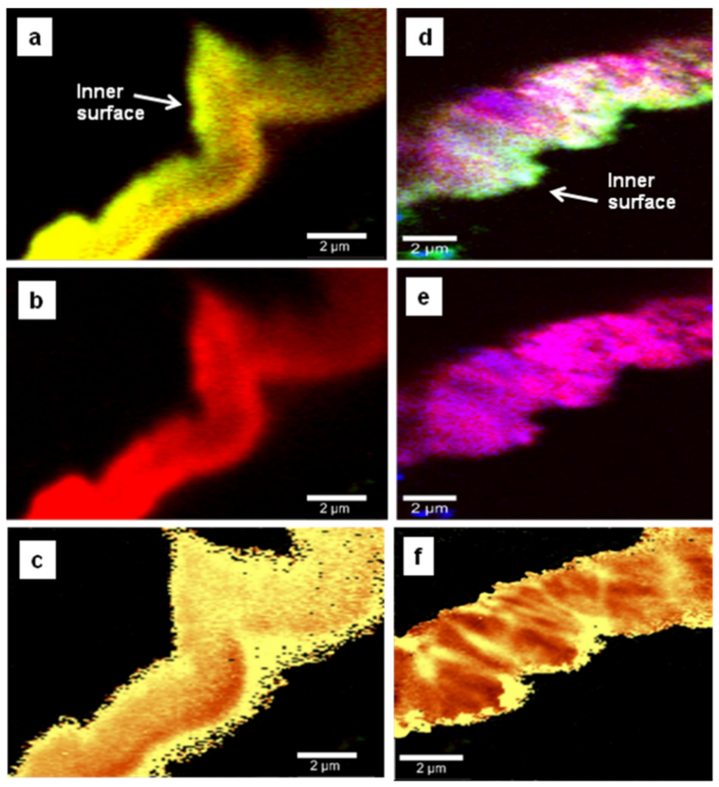 Another important source of the induced stress in the material is the lattice mismatch between tungsten and diamond, which should occur more near the interface between the two materials. To asses this interface effect, we performed side-wall confocal Raman mapping, and the results are presented in Figure 4a–f and Figure 5a–f. Even though no evidence of tungsten carbide formation was found, Figure 4a,d and Figure 5a,d show a strong accumulation of carbon impurities close to the surface of the tungsten rods. Again, a lower amount of trimethylborane (TMB) feed gas used during deposition results in a more uniform incorporation of boron throughout the entire film thickness (a relatively uniform magenta color is observed in Figure 4d). For a considerably higher amount of TMB, preferential boron incorporation, with an obvious radial, columnar growth, is occurring (see Figure 5b). Comparison between the images for chemical composition of the films and the induced stress (see Figure 4a,c,d,f and Figure 5a,c) reveals an obvious correlation between the stress and the excessive presence of carbon impurities at the interface with tungsten. Shifts of the diamond vibrational line with values as high as 20 ± 1 cm−1 (6.7 GPa) were obtained for these bright yellow regions. We do not exclude the possibility that the lattice mismatch has some contribution to such high values of compressive stress.