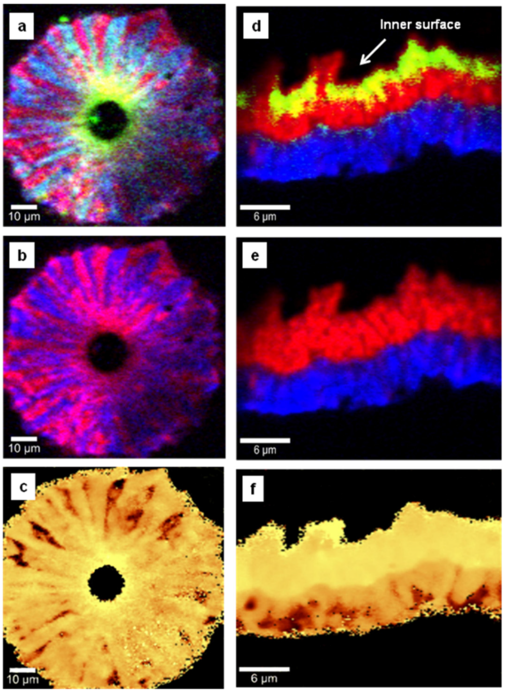 Figure 4. Side-wall confocal Raman images of undoped diamond thin film mapping the spatial distribution of (a) diamond (red) and sp2 carbon (green), (b) diamond only, and (c) induced stress. Side-wall confocal Raman images of lightly boron-doped thin film showing: (d) all the material constituents, (e) diamond and boron incorporation, and (f) induced stress. Red, blue, and green pseudo-colors are used in image (d) for diamond, boron, and carbon impurities, respectively. While in image (a) yellow originates from superposition of red and green, in the stress images (c) and (f), bright yellow and brown correspond to higher or lower induced stress, respectively.