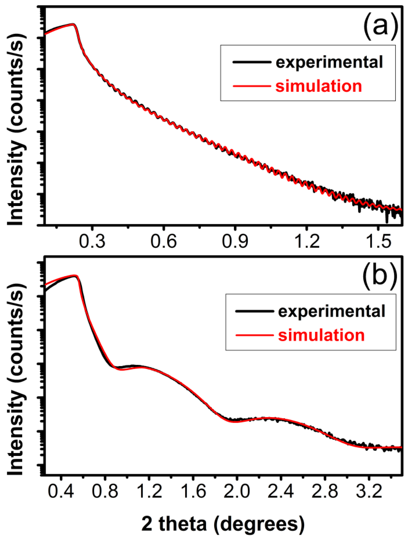 Typical X-ray reflectivity (XRR) patterns (red line) and the best fit (black line) of carbon films obtained in (a) vacuum and (b) 10 mbar CH4 at 200 °C on bare Si (100) substrates.