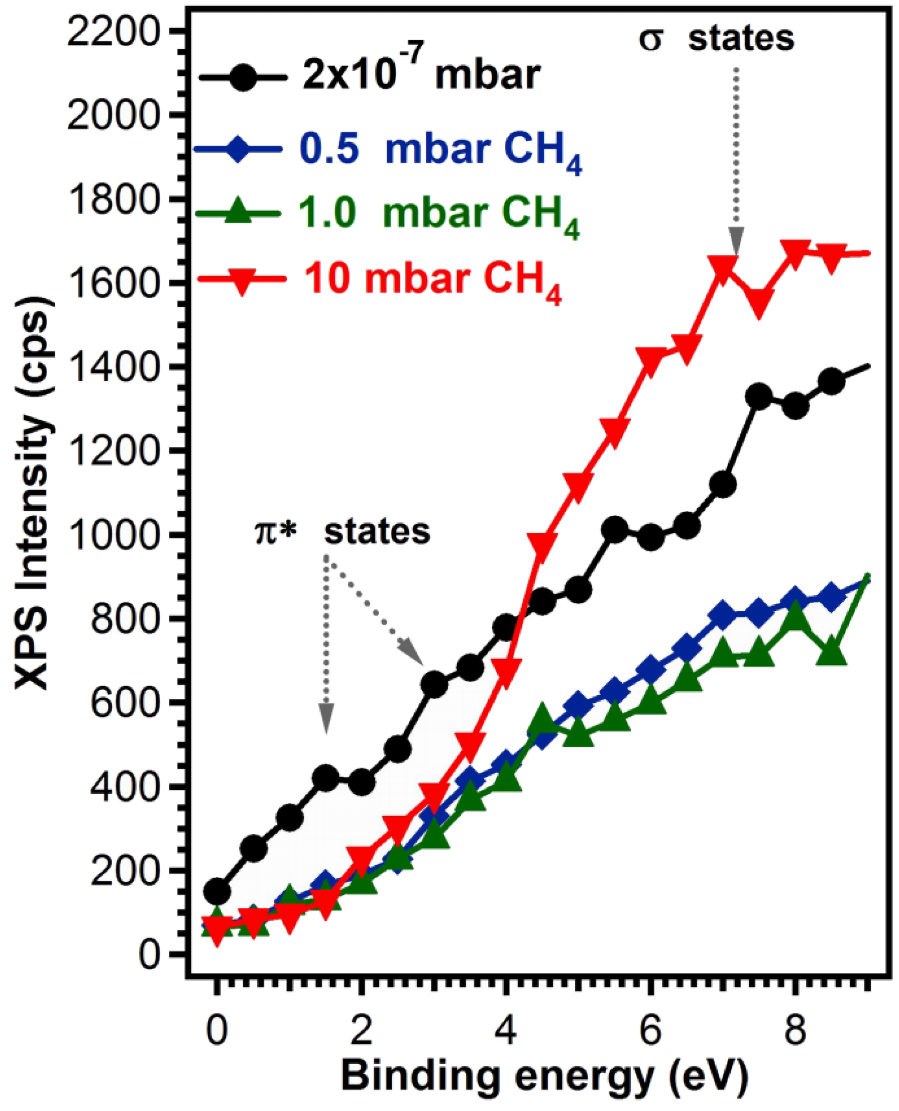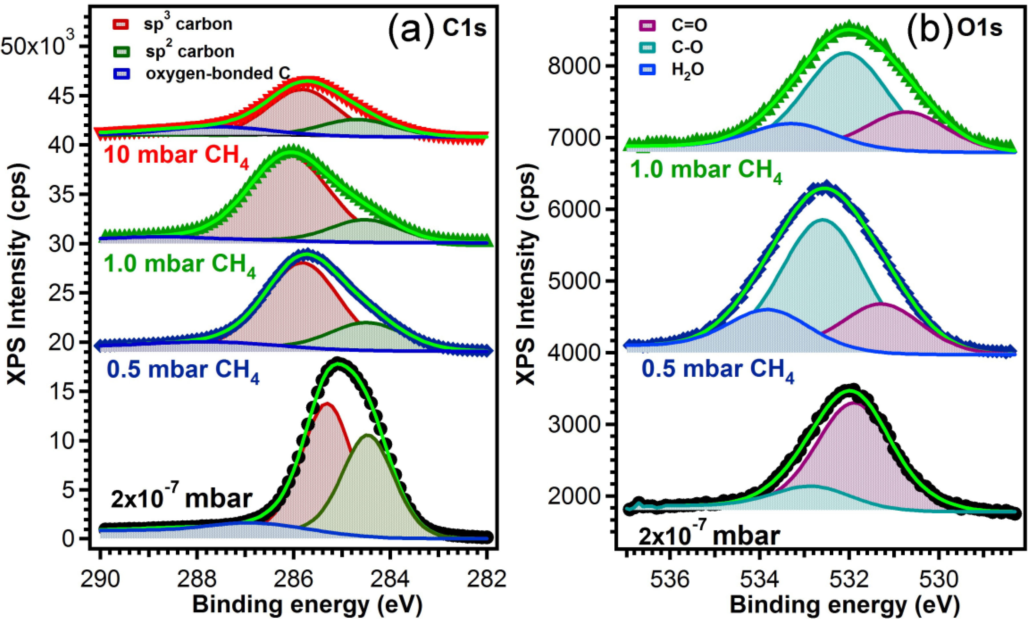 XPS spectra were recorded in a dedicated chamber (Specs GmbH, Berlin, Germany), under ultra-high vacuum (base pressure ~10−10 mbar), using Al Kα = 1486.71 eV monochromatized radiation. The electrons were collected using a hemispherical electron energy analyzer (Phoibos 150) (Specs GmbH, Berlin, Germany) operated at a 20 eV pass energy. Resolution (in terms of full width at half maximum (FWHM)) of 0.45 eV was achieved. During measurements, a flood gun operating at 1 eV acceleration energy and 1 mA electron current was used in order to ensure sample neutralization. The experimental data were fitted with Voigt profiles i.e., a Gaussian line convoluted with a Lorentzian one. The Gaussian components account mainly for the instrumental resolution while the Lorentzian line is connected to the finite core-hole lifetime associated with the photoionization process. XPS analysis and valence band photoemission, indicating respectively the C1s and O1s core level variation and a transition towards insulating, gapped state which accompanies the sp3 bonding of carbon atoms, were used in order to assess the amount of sp2 and sp3 bonded C in the samples prepared in vacuum and at various CH4 pressures.