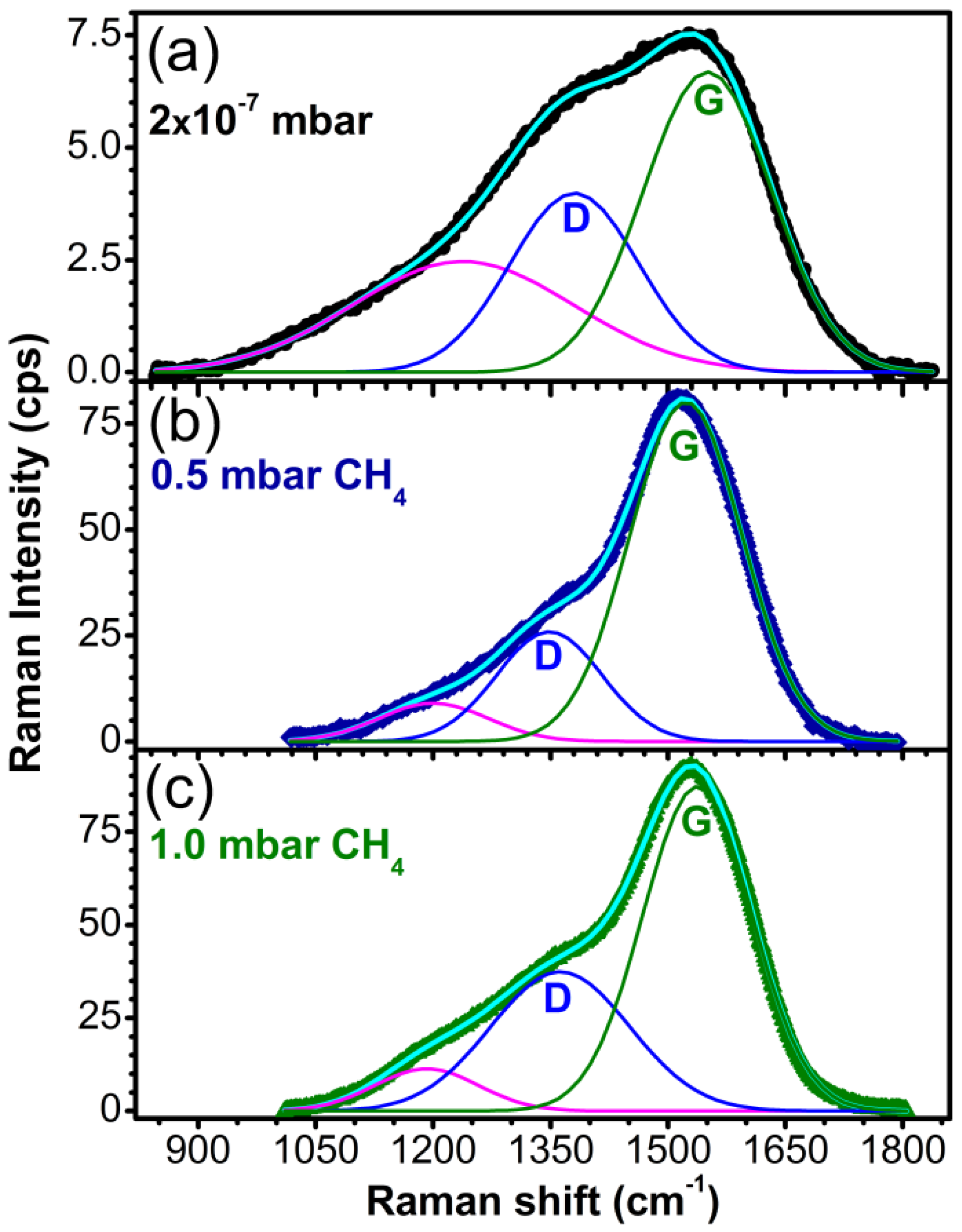 In the case of the sample synthesized in vacuum, the G band position was set to 1570 cm−1 corresponding to an ID/IG ratio of 2.6 and a sp3 content of 20%–25%. For the sample synthesized in 0.5 mbar CH4, the position of the G band was found at 1523 cm−1, the ID/IG ratio was estimated at ~0.3, with the sp3 concentration reaching its maximum (60%–65%). Increasing the pressure to 1 mbar CH4 during depositions, the G peak shifted to 1538 cm−1 resulting in films with an ID/IG ratio of ~0.54 and 50%–55% sp3.