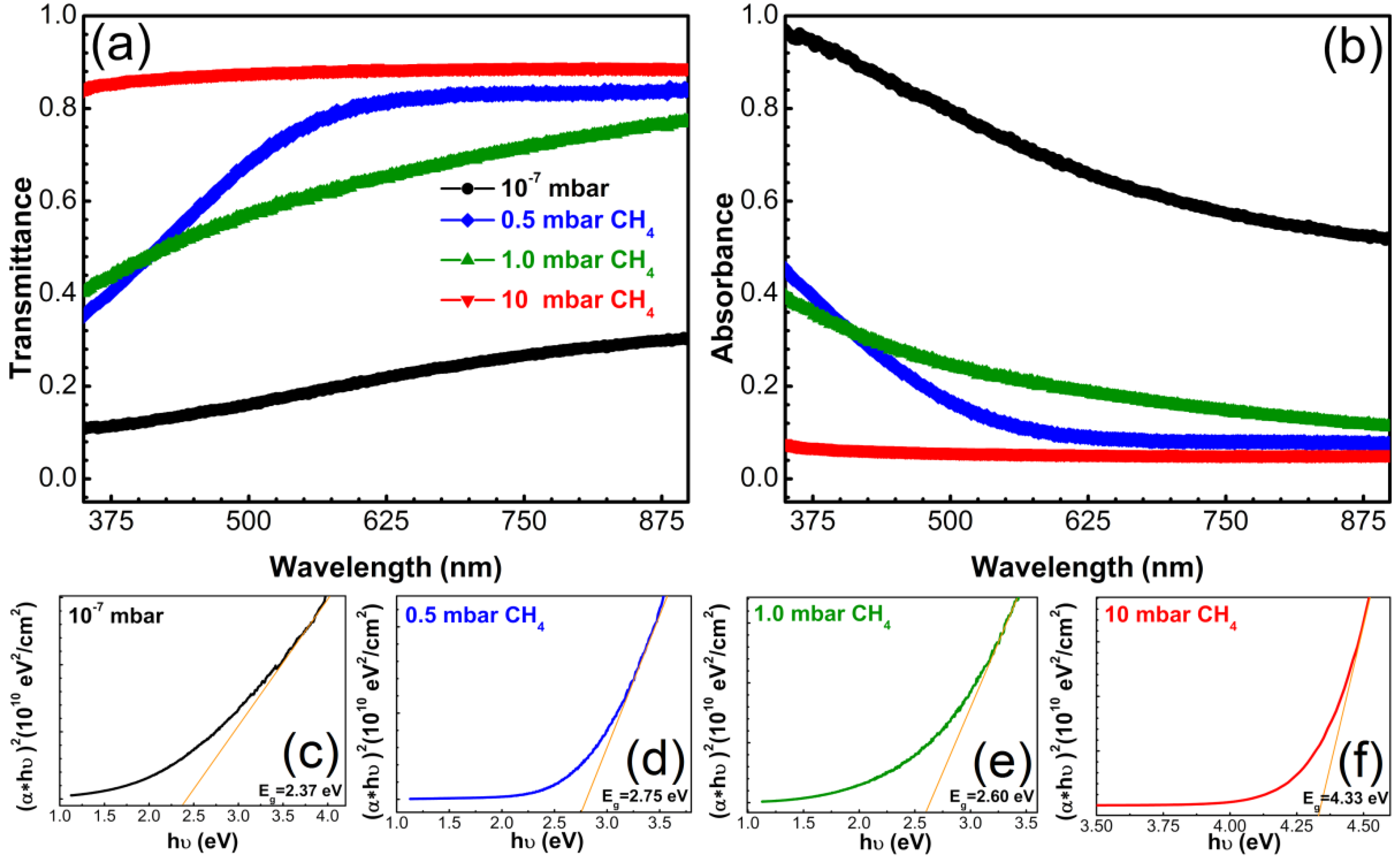 (a) Transmittance and (b) absorbance spectra of carbon films synthesized by PLD in different deposition ambients on bare quartz substrates; (c–f) Tauc plots for assessment of the optical band gap.