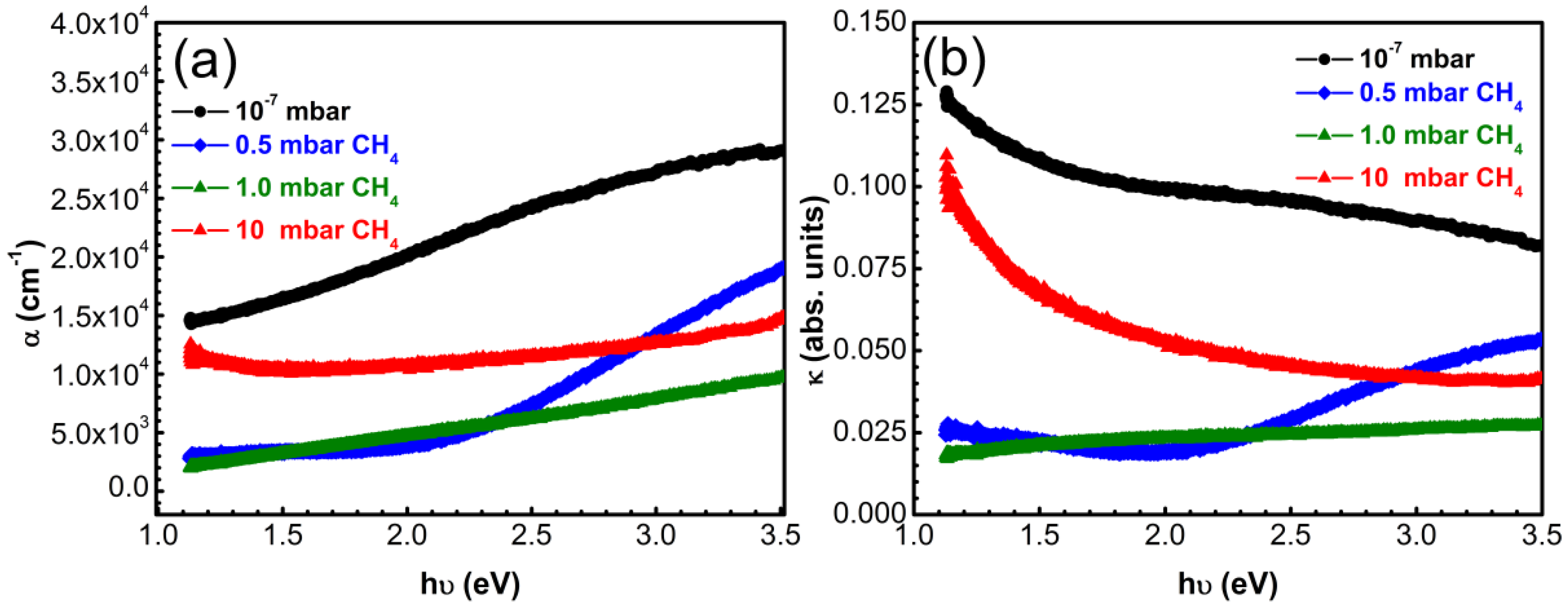(a) Absorption coefficient α and (b) extinction coefficient k vs incident photons energy in case of carbon thin films synthesized by PLD in vacuum or CH4 on bare quartz substrates.