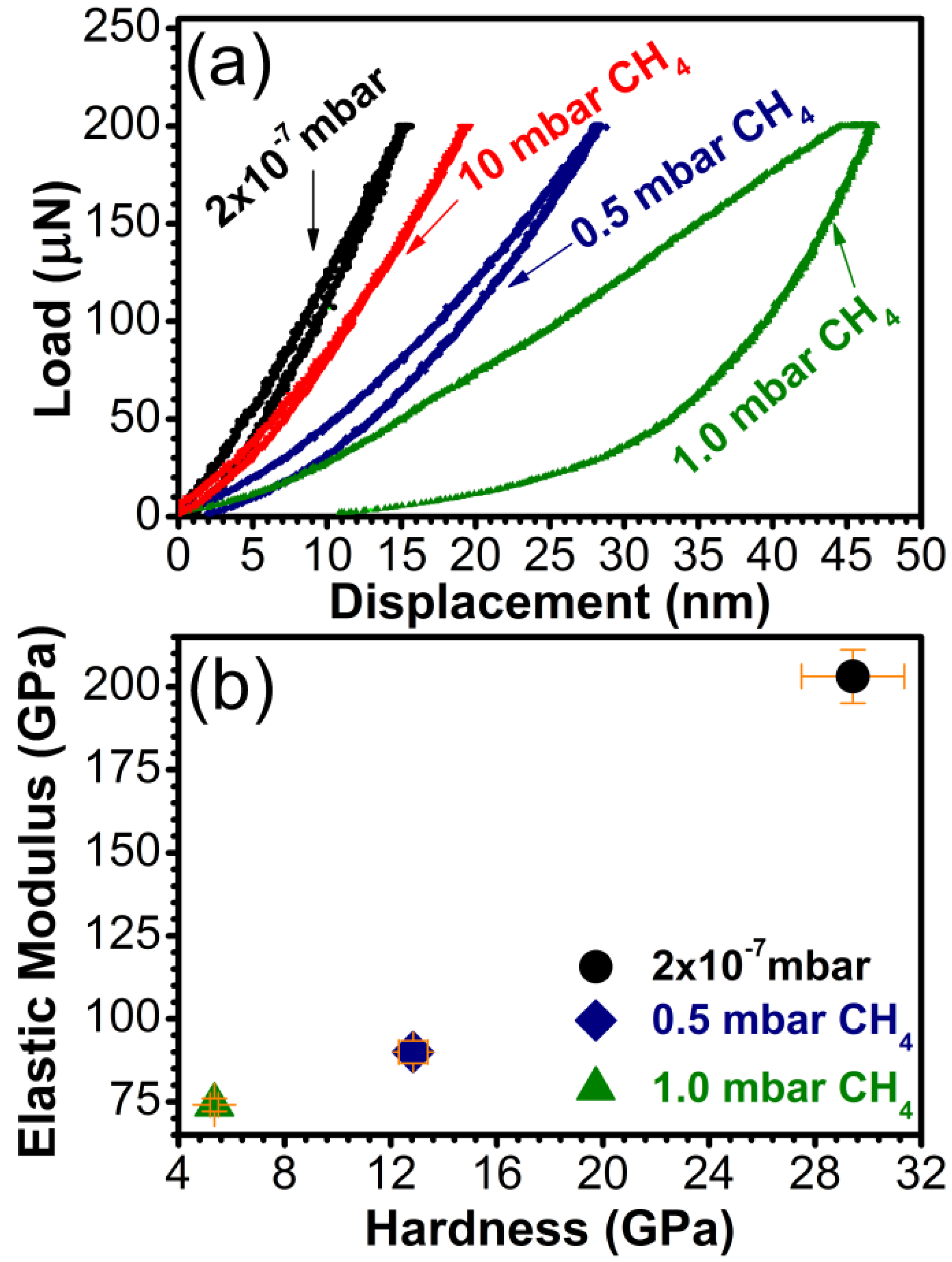 (a) Characteristic load vs. displacement curves and (b) Hardness and elastic modulus for carbon samples synthesized by PLD in vacuum and in 0.5, 1, or 10 mbar CH4 pressure on buffered Si (100) substrates.