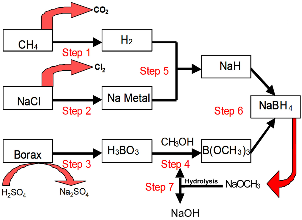 - Step 6. Synthesis of NaBH4 via the reaction of trimethyl borate with sodium hydride.