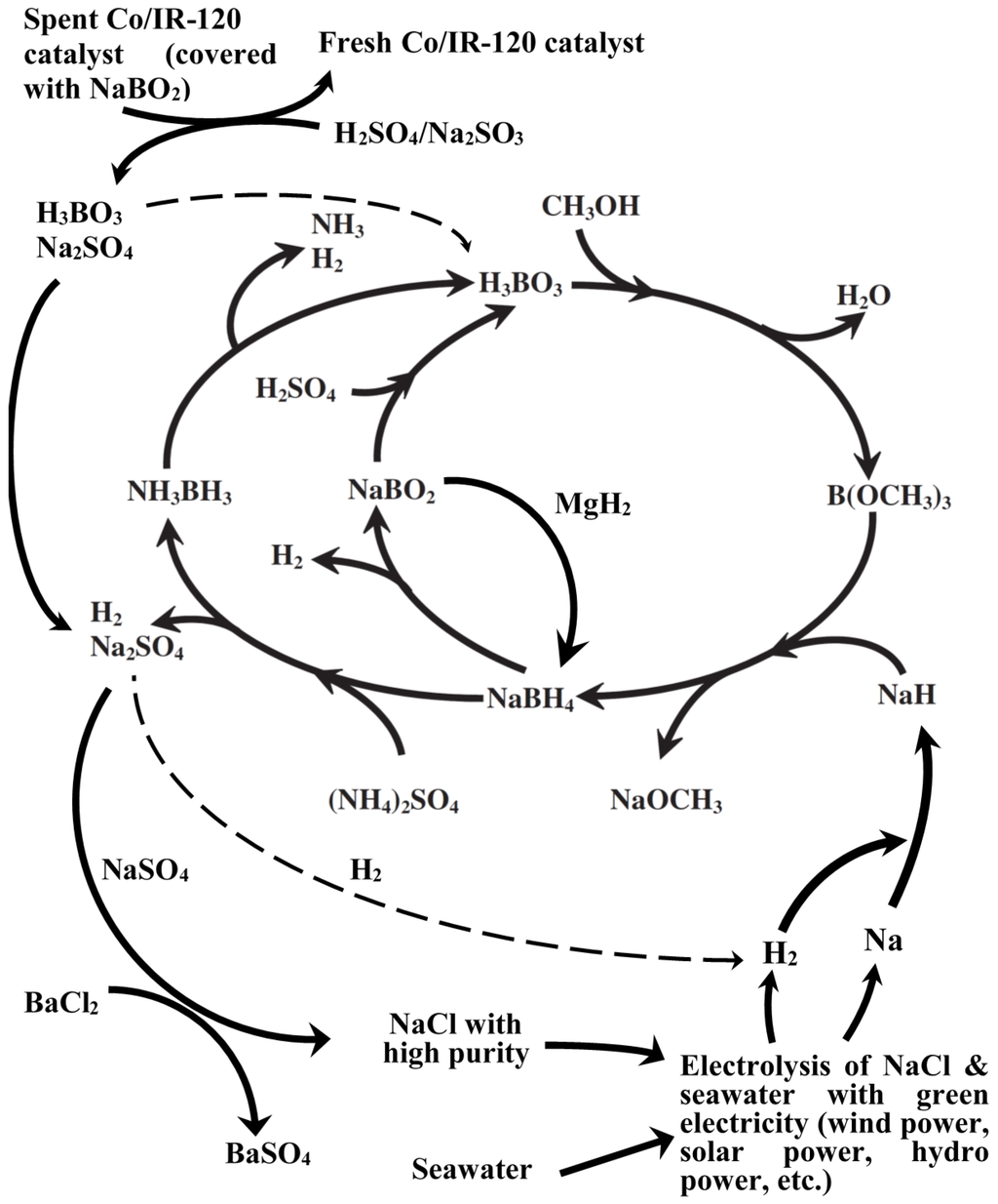 The rest left in the solution after filtering-out H3BO3 crystals is dominantly the Na2SO4. BaCl2 can be introduced to precipitate out BaSO4 and to leave NaCl in the solution phase (Figure 3). Finally, Na metal and hydrogen gas can be obtained from the electrolysis of the NaCl solution with the green electricity, Namely, the introduction of the green electricity to the recycling and regeneration processes of the spent borohydrides and NH3BH3 as well as the used catalysts could increase the sustainability of the chemical hydride H2-fuel system and, therefore, realize the hydrogen economy.