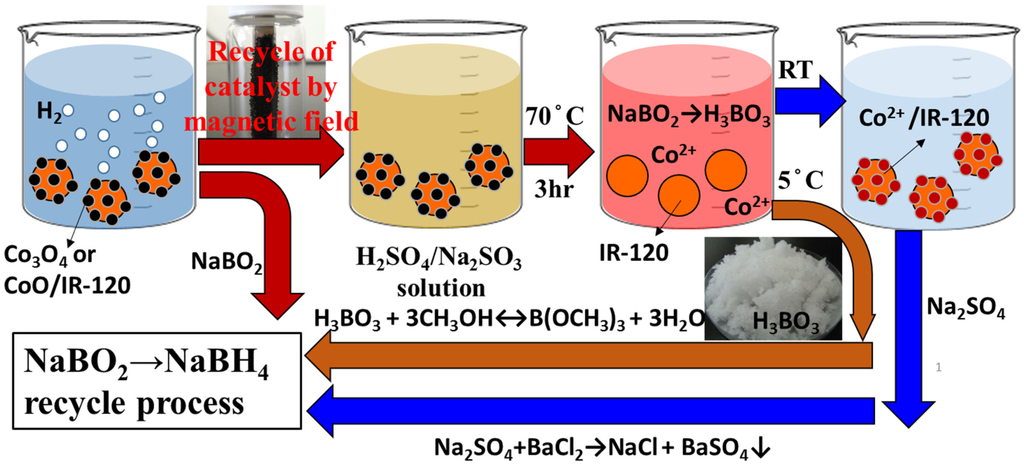 The boric acid could be easily separated from the reacting mixture by crystallization at a lower temperature. For example, being cooled to 5 °C, needle-like H3BO3 crystal appears and precipitates out from the coexisting Na2SO4(aq) [22]. Thus, boric acid could be conveniently collected through filtration. The boric acid will be, subsequently, esterified with excess methanol to yield trimethyl borate [22], which can be further converted to NaBH4 with NaH, according to the commercial Brown-Schlesinger process. Besides, the fresh Co2+ ions can be chelated with the benzenesulfonyl groups on the IR-120 ion exchange resin beads again to generate the fresh Co/IR-120 catalysts to complete the regeneration process of the used catalyst.