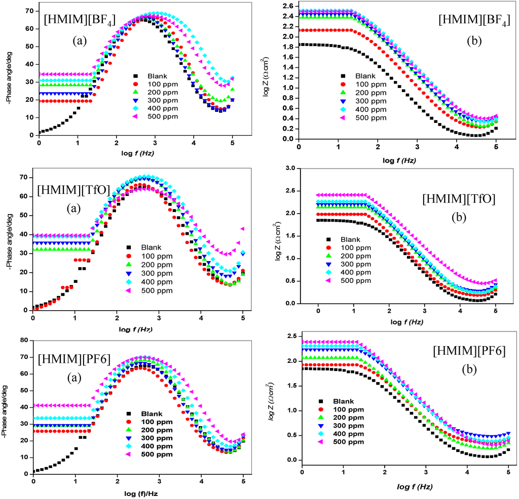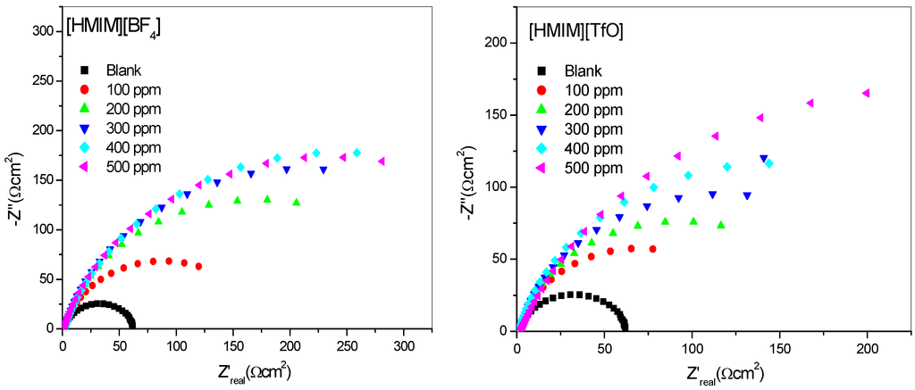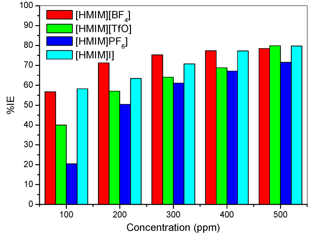 It was also observed that the %IE increases as the concentration of the ILs increases reaching a maximum value of 79.88% for [HMIM][TfO] at 500 ppm. The plot of %IE values obtained from the electrochemical impedance spectroscopy study versus concentration of inhibitors is shown in Figure 6. The variation of %IE with concentration shown in Figure 6 is similar to the one presented in Figure 2 for the potentiodynamic polarization experiments. The discussion of the trend of %IE for the studied ILs presented under Section 2.1.1 therefore applies.