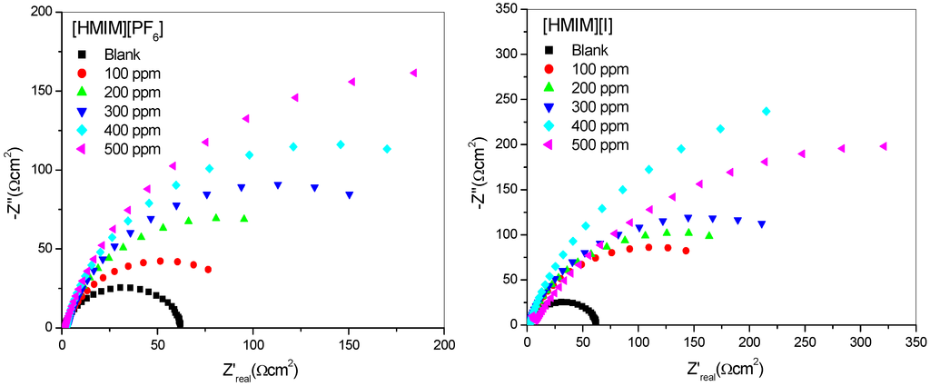 Nyquist plots for mild steel in 1 M HCl without and with different concentrations of [HMIM][BF4], [HMIM][TfO], [HMIM][PF6] and [HMIM][I].