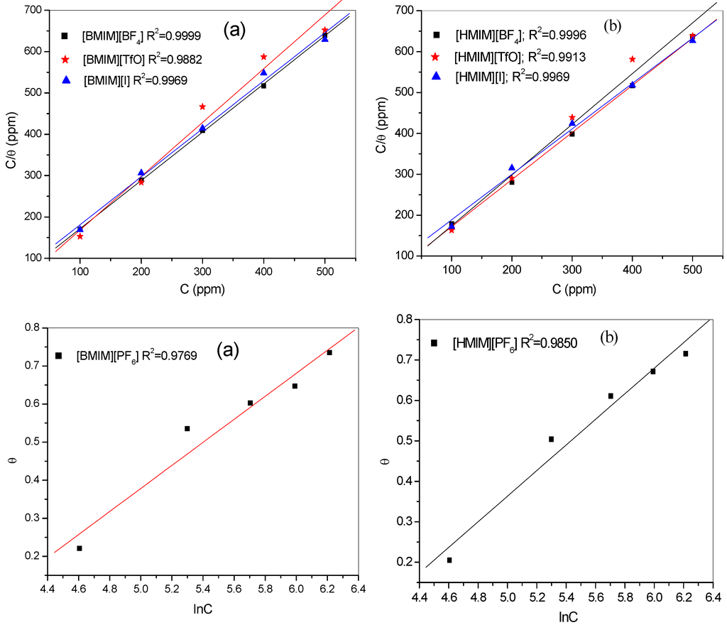 Adsorption isotherms are used to describe the nature of metal/inhibitor interactions. The results obtained from both the polarization and impedance studies were fitted into different adsorption isotherms. Adsorption of [HMIM][BF4], [HMIM][TfO], and [HMIM][I] were found to obey the Langmuir adsorption equation of the form: