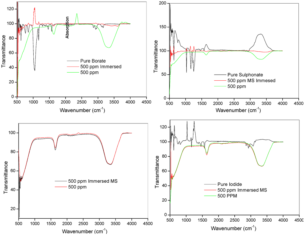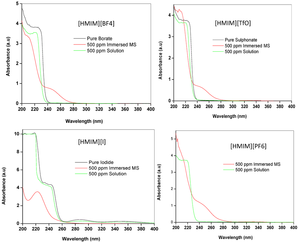 The FTIR and UV-vis experiments were carried out on the pure ILs and also on the resulting solutions from the aggressive media containing 500 ppm of the studied ILs after 24 h of mild steel immersion. Fourier transform infrared spectrophotometer (Cary 600 series FTIR spectrometer by Agilent Technology) and the UV-visible spectrophotometer (Cary 300 series UV-vis spectrometer by Agilent Technology) were used for the FTIR and UV-vis studies respectively. Mild steel samples immersed in the aggressive solutions were prepared as explained in Section 3.1 above. The FTIR spectroscopic measurements were recorded between 500–4000 cm−1 wavenumbers, while the UV-vis absorption profiles were recorded between 200–400 nm wavelengths in the double-beam UV-vis equipment using the 1 cm quartz cell.