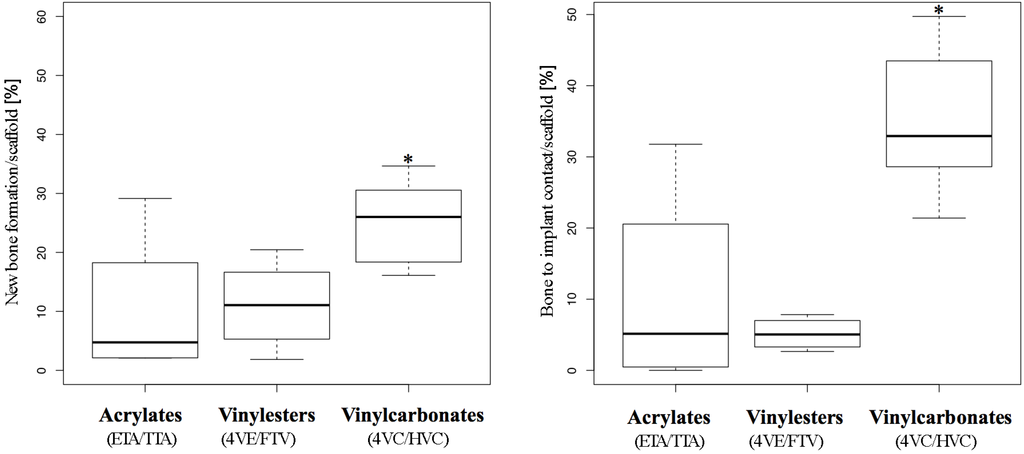 Compared to the acrylates, which served as control, the vinylesters did not lead to a significantly higher new bone formation. As monomer toxicity can be ruled out as a reason for this finding, the high amount of hydrophobic 4VE within the vinylester resin could be related, as the histological pattern (see Figure 5d) shows a tendency to quite broad gaps between newly formed bone and polymer scaffold.