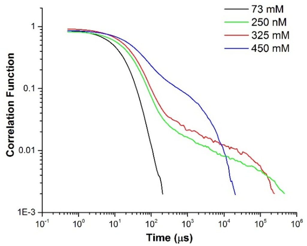 Dynamic Light Scattering (DLS) measurements were carried out on separate SLES/CapB (14% w/w : 2% w/w) solutions at different salt concentrations. Figure 1 illustrates the evolution of the correlation function with increasing NaCl concentration. For clarity of the figure, data is shown for four NaCl concentrations.