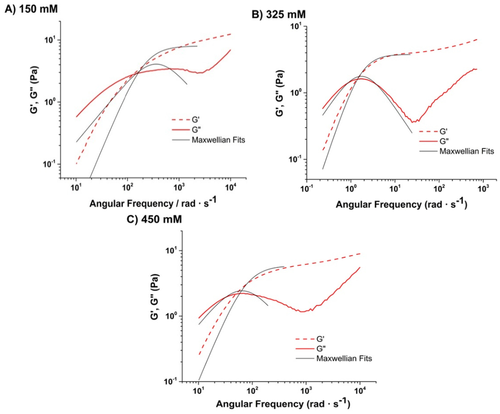 Evolution of frequency response of G′, G″ of SLES/CapB with increasing NaCl concentration: (A) 150 mM; (B) 325 mM and (C) 450 mM. Solid black lines are fits to the Maxwell model.