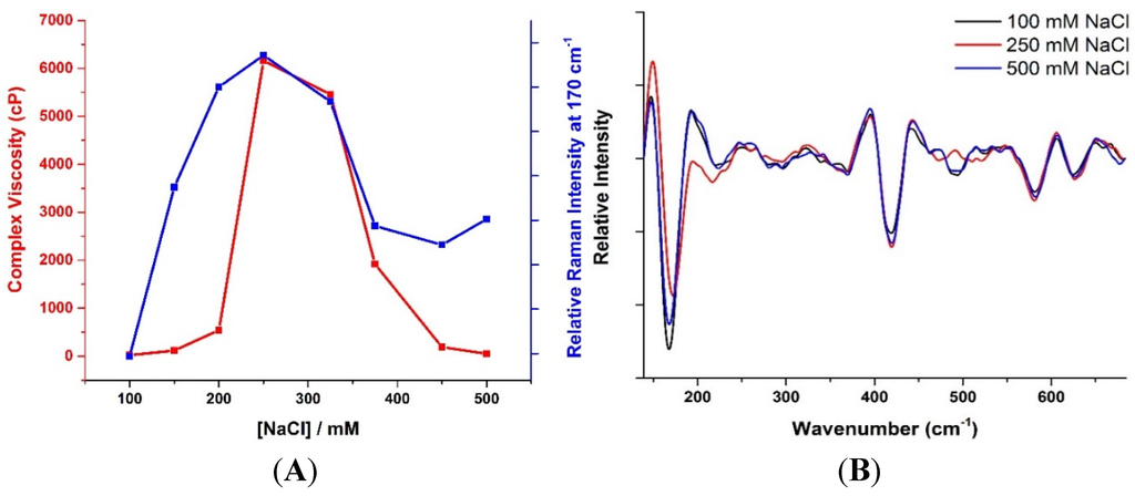 One way to gain mechanistic insight from these rheological changes is to monitor changes in water dynamics as a system undergoes gelation and self-assembly. The water dynamics can be determined through a number of different bands such as: 1) the low frequency bands at 60 cm−1 or 170 cm−1, which correspond to stretching and bending modes of hydrogen bonds between water molecules [32]; 2) the water bending band near 1645 cm−1; 3) combination of bending and librational bands near 2100 cm−1; and 4) the O-H stretching vibration band between 2800 and 3600 cm−1. Previous studies on gelation and self-assembly have focused on the O-H stretching band between 3200 and 3600 cm−1, and have primarily followed the change in dynamics of water, both bulk and bound forms. A recent study on agarose [33] monitored changes in dynamics of bound water through the band at 170 cm−1, and established a clear link between the evolving rheology in the system and water structuring in the polymer network. In this study, we continue to probe the degree of confinement of water in this self-assembling, worm-like system by monitoring changes in the intensity of this band. Figure 5 illustrates the variation of viscosity in conjunction with the Raman intensity at 170 cm−1. In general, the correlation between the viscosity and this peak intensity variation with NaCl concentration is consistent, with both showing a maximum at 250 mM NaCl and then dropping at higher NaCl concentrations. Although the viscosity drops to almost similar levels as exhibited at low salt concentrations, the low frequency Raman intensity does not completely recover at low NaCl concentrations. The intensity of this band at 170 cm−1 is linked to the damped stretching intermolecular modes of hydrogen bonded species and is sensitive to different structures of water [34,35,36]. The change in the intensity of the 170 cm−1 feature with initial increase in NaCl concentration is associated with enhanced water structuring and increased tetrahedral ordering of water [37,38,39]. From a microstructural perspective, this change may be attributed to an increase in the number of bound water molecules as the micelles grow from spherical to cylindrical. As the NaCl concentration is increased further, the viscosity and low frequency Raman intensity both drop, however the intensity does not return to the levels measured at low NaCl concentrations. This implies that the water molecules are becoming less structured, and that there is less correlated motion between water molecules, but not to the same levels as when the micellar system is unentangled or composed of short cylinders (at low NaCl concentration).