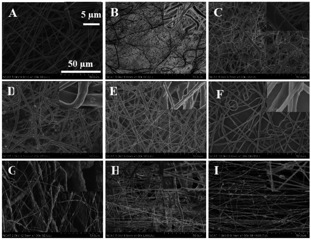 SEM images of electrospun nanofibers of poly(ε-caprolactone) (PCL)/MgO with ratios of (A) 1:0, (B) 1:0.05, (C) 1:0.10, (D) 1:0.20, (E) 1:0.50, (F) 1:1, (G) 1:1.5, (H) 1:2; and PCL-K/MgO (I) 1:1. The insets show higher magnification images of each corresponding SEM images. The scale bar in the inset represent 5 µm for the insets; scale units for the lower magnification are on the figures (i.e., 50 µm).