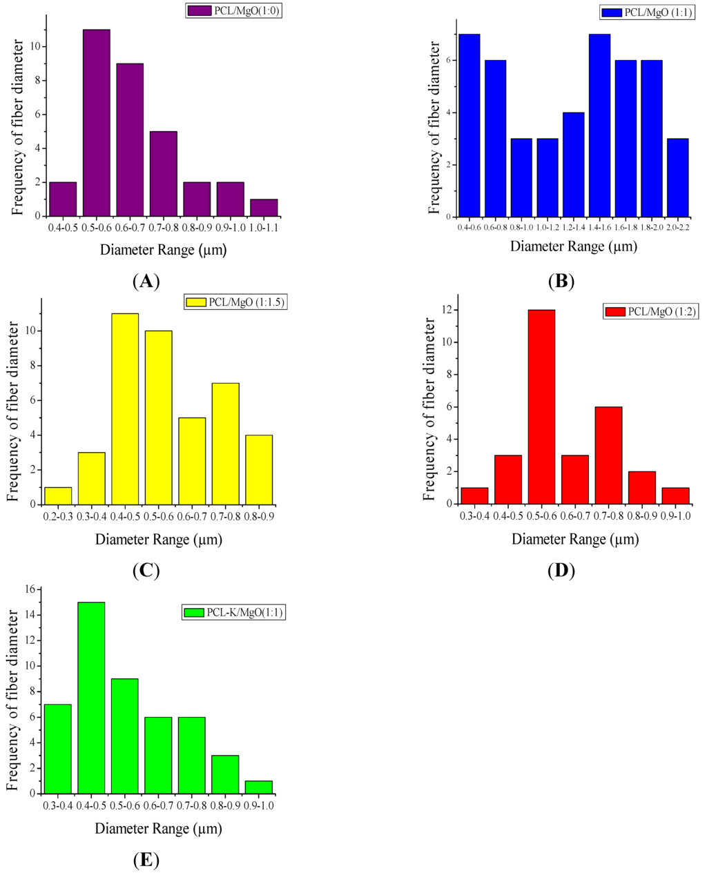 Specifically, the frequency distribution of nanofiber diameter of PCL/MgO ratios of 1:1, 1:1.5 and 1:2, as well as the PCL-K/MgO ratio of 1:1 were further analyzed in this study. The PCL/MgO (1:1) nanofiber diameter was distributed in the range of 0.4 µm–2.2 µm; however, for the nanofibers with precursor solution of PCL/MgO (1:1.5) and PCL/MgO (1:2), the diameter distribution was in the narrower region of 0.2 µm–0.9 µm, and 0.3µm–1.1 µm, respectively, as shown in Figure 2. The PCL-K/MgO (1:1) nanofiber diameter distribution was from 0.3 µm to 0.9 µm. All of the ratios of precursor solution had the highest frequency of nanofibers distribution from 0.4 µm to 0.6 µm.