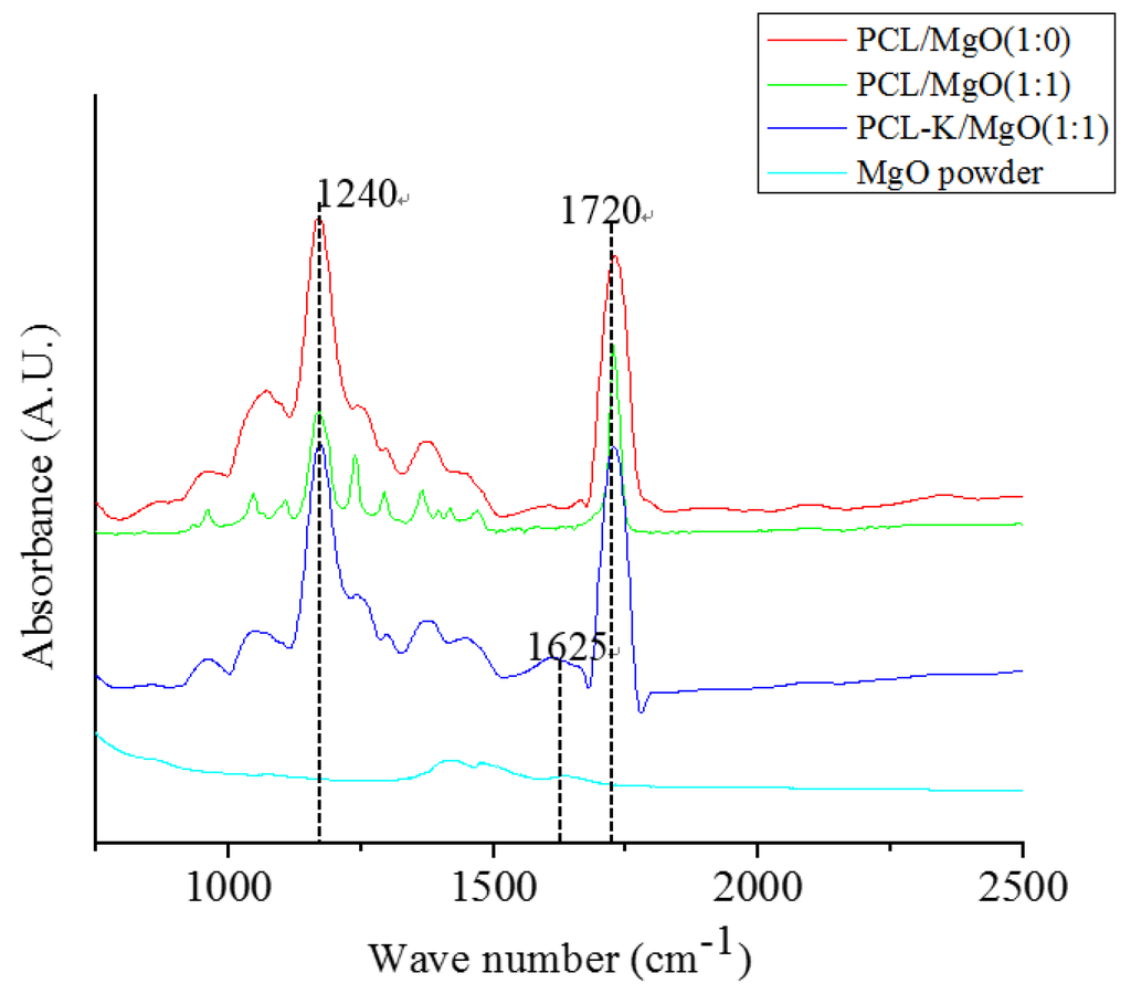 Figure 3 shows the FTIR spectra of the electrospun PCL/MgO and PCL-K/MgO nanofibers. The characteristic features of PCL and keratin in the nanofibers were observed in the spectra. PCL shows a strong absorption band at 1720 cm−1 corresponding to the carbonyl groups, C–O stretching at 1050 cm−1, and C–O–C stretching at 1240 cm−1 [6]. Keratin proteins give rise to amide I (1600–1700 cm−1) [29]. The spectra for the PCL-K/MgO (1:1) nanofiber shows an absorption band at 1625 cm−1, which is not seen in other compositions.