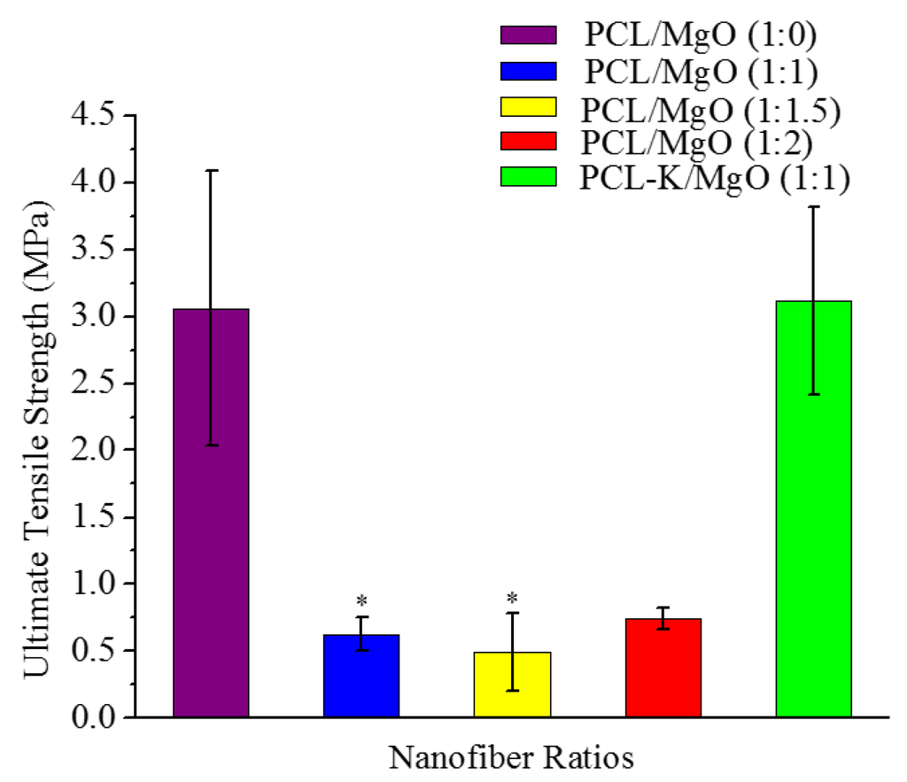 Ultimate tensile strength of PCL/MgO and PCL-K/MgO nanofibers, n = 5. Asterisks denote statistical significance (p < 0.05) compared to the PCL/MgO (1:0) nanofibers.