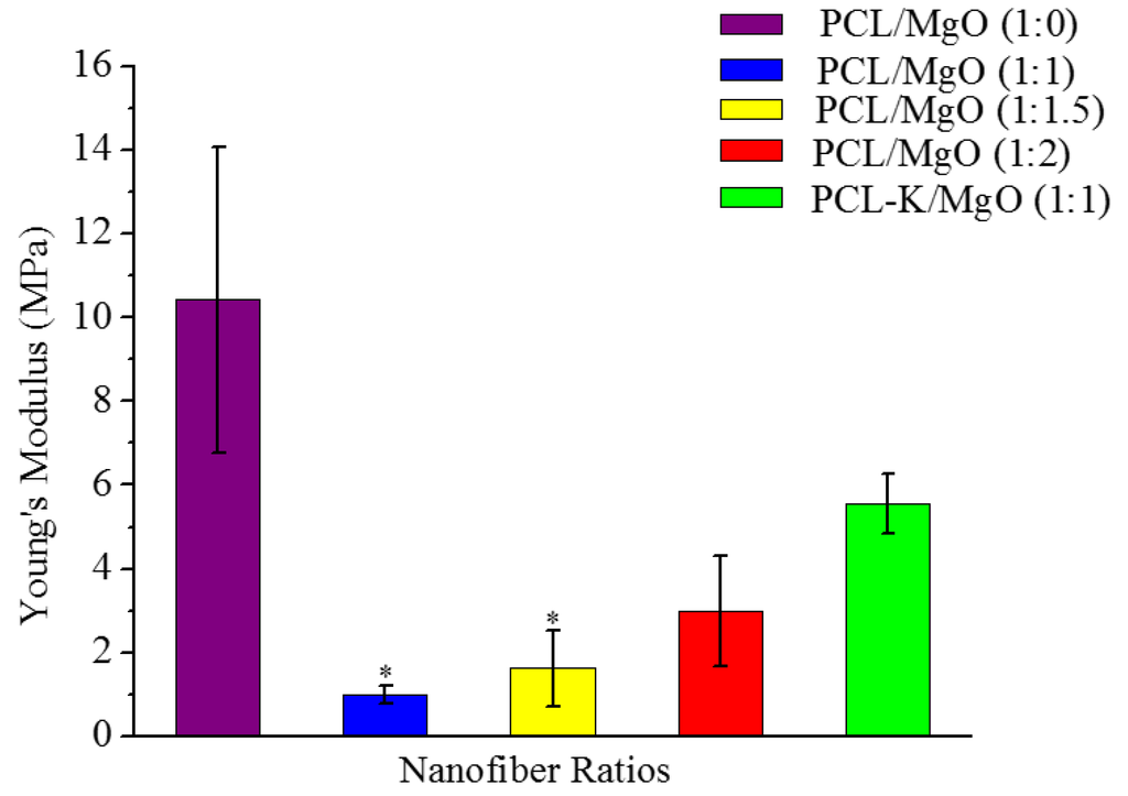Young’s modulus of PCL/MgO and PCL-K/MgO nanofibers, n = 5. Asterisks denote statistical significance (p < 0.05) compared to the PCL/MgO (1:0) nanofibers.