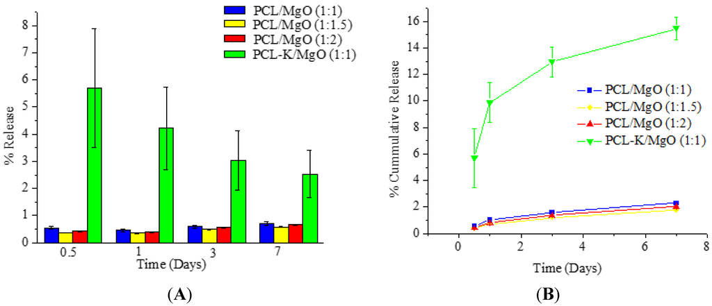 When PCL/MgO and PCL-K/MgO nanofibers degrade, Mg is released into the degradation medium. The release study of Mg from nanofibers was done with the use of an ICP-OES. PCL-K/MgO nanofiber samples released magnesium significantly more over time compared to all other PCL/MgO nanofiber samples, as shown in Figure 7. However, for the PCL-K/MgO nanofibers, the individual daily release of magnesium decreased over time. PCL is characterized as being hydrophobic, whereas keratin is characterized as being hydrophilic. Due to the hydrophilic nature of the polymer and the presence of hydrolysable amide bonds, keratin shows bulk eroding characteristics, readily allowing permeation of water into the polymer matrix, and degrades throughout the nanofiber [35,36]. Bulk-eroding polymers are often characterized by a burst of drug release during the first few hours of incubation, followed by a slow, diffusion-controlled release [37]. In contrast to keratin, PCL shows surface eroding behavior and degrades very slowly due to the presence of five hydrophobic CH2 moieties in its repeating units and a high degree of crystallinity [38]. This is the reason for very low magnesium release in PCL/MgO nanofibers when compared to PCL-K/MgO nanofibers, which shows greater release of magnesium contributed by the high degradation rate of keratin.
