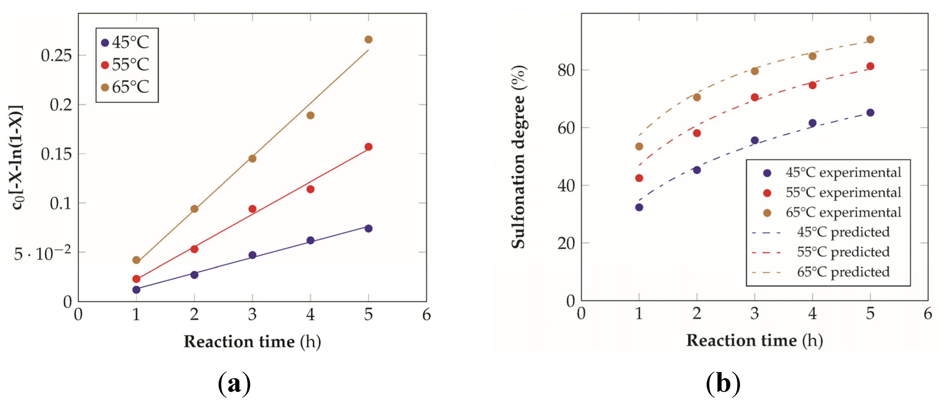 Kinetic modeling of the sulfonation reaction: (a) linearization of the kinetic expression as a function of time, (b) comparison between the experimental data and the model prediction (R2 = 0.98 for the data at 45 °C, R2 = 0.97 for the data at 55 °C, R2 = 0.99 for the data at 65 °C).