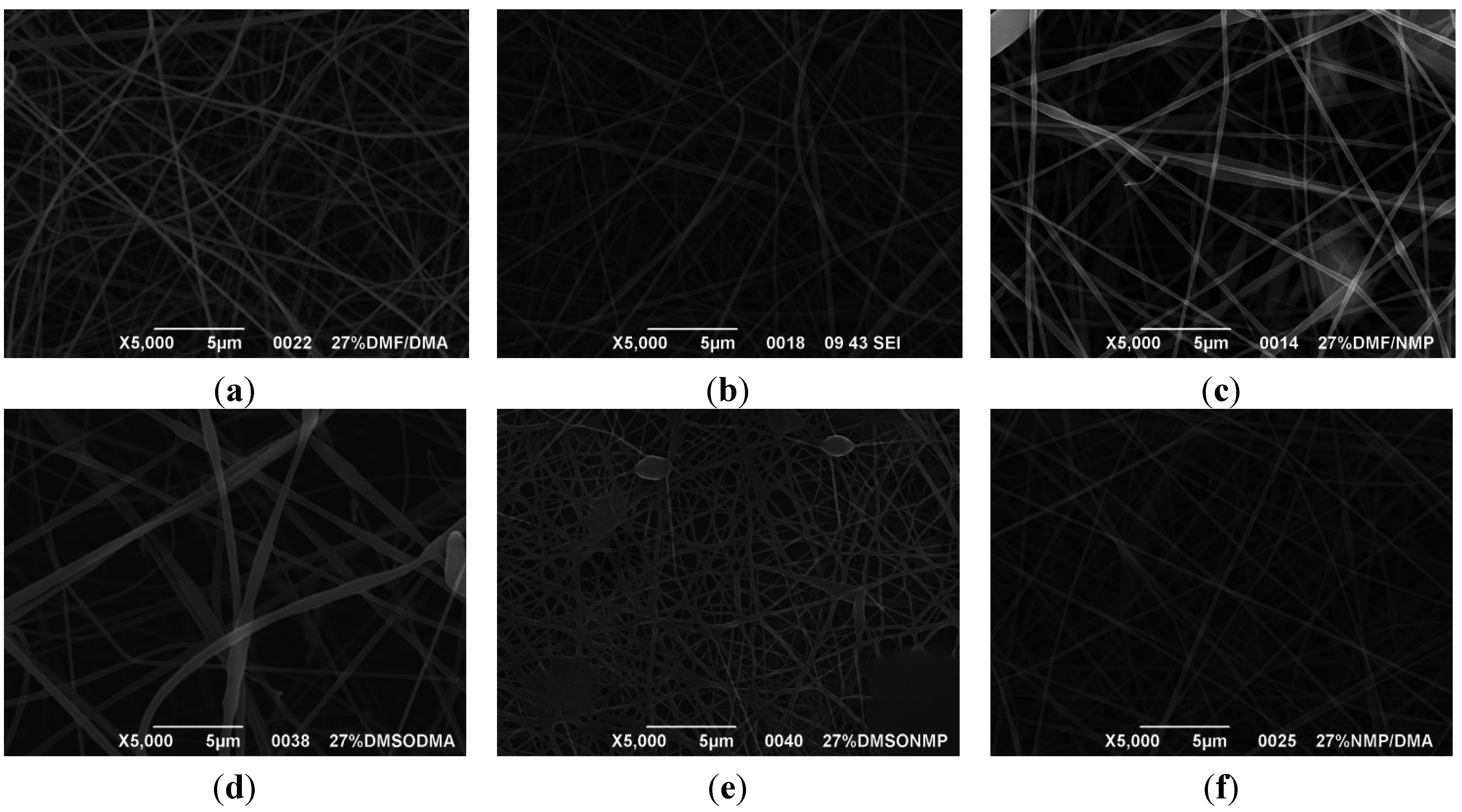 The results showed that the best morphology can be obtained by mixing DMF with DMAc (Figure 4a). Only in this case the properties of the solvents and the polymer concentration can lead to the formation of smooth and quite uniform fibers. The samples, electrospun with the DMF/NMP (Figure 4c) and DMAc/NMP (Figure 4f) mixtures, present a beads-on-fiber morphology that gives fibers high non-uniformity. Despite the fact that at a 27 wt % concentration the solution with only DMSO as solvent produced ribbons instead of fibers, some samples of the mixture with DMSO were realized. Mixing DMSO with DMAc (Figure 4d) at the given concentration, it is possible to produce fibers, even though they seem irregular with significant variation of the diameter along a single fiber. The DMSO/NMP (Figure 4e) samples presented the worst morphology due to the presence of both beads along fibers and branched jets, in which smaller jets were formed on the surface of primary jets.