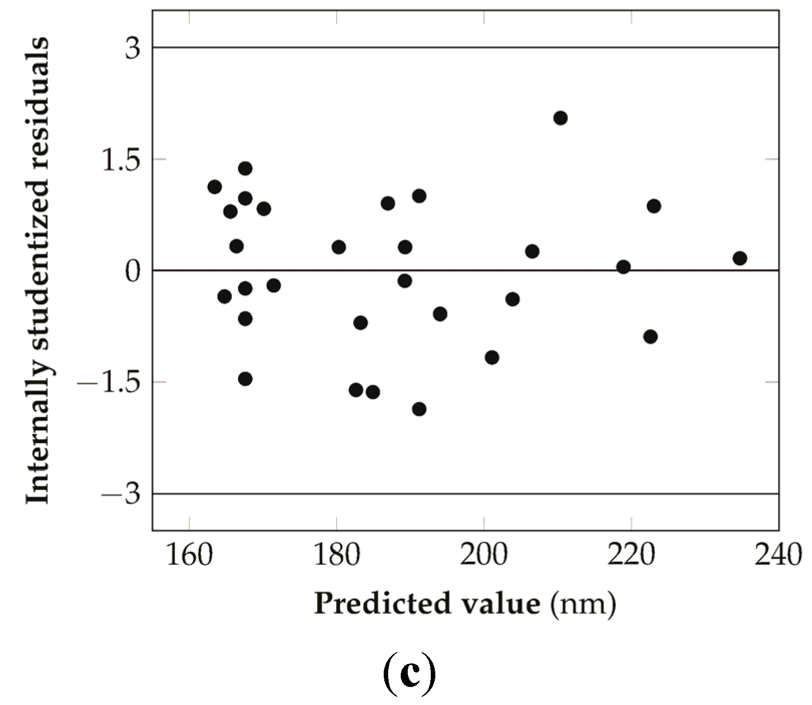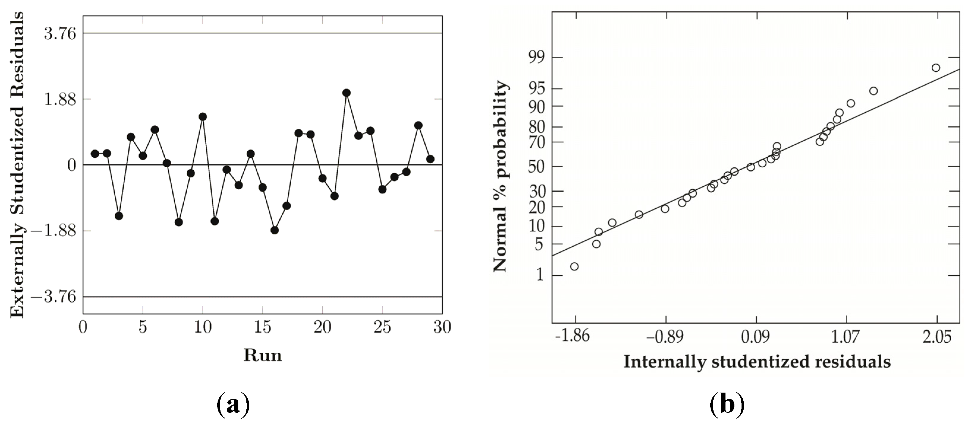 Diagnostic plots for the check of the consistency of the model developed: (a) Residuals versus run for the check of the presence of time-related variable lurking in the background, (b) Normal probability plot for the check of the normal distribution of the residuals, (c) Residual versus predicted values plot for the check of the assumption of constant variance of the residuals.