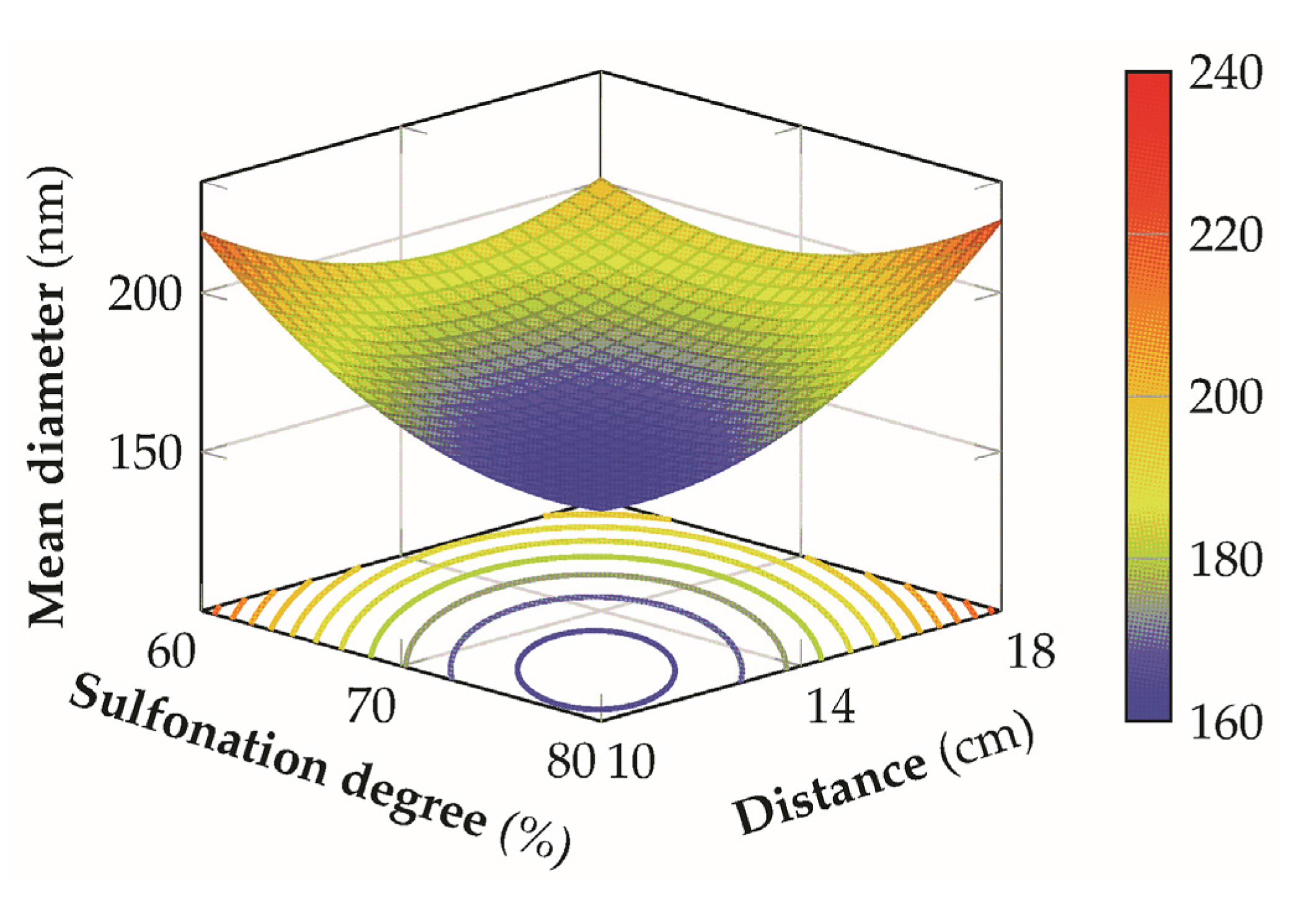 3D response surface of the mean diameter for the sulfonation degree versus distance at an applied voltage of 25 kV and a flow-rate of 0.125 mL/h.