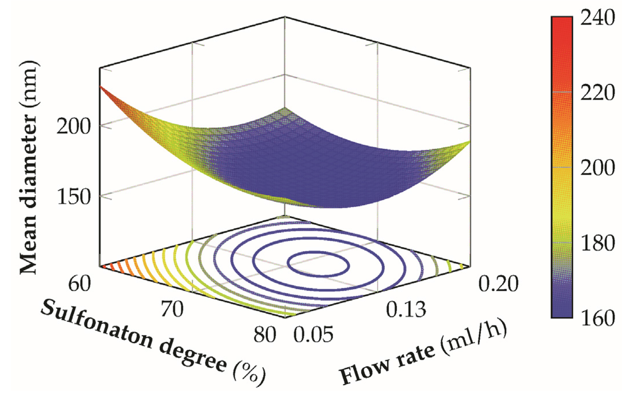 3D response surface of the mean diameter for the sulfonation degree versus flow-rate at an applied voltage of 20 kV and at a distance of 14 cm.