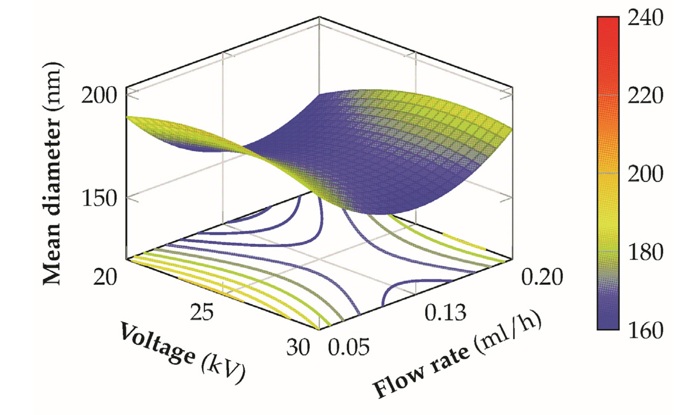 3D response surface of the mean diameter for the voltage versus flow rate at a sulfonation degree of 70% and a distance of 14 cm from the tip to the needle.