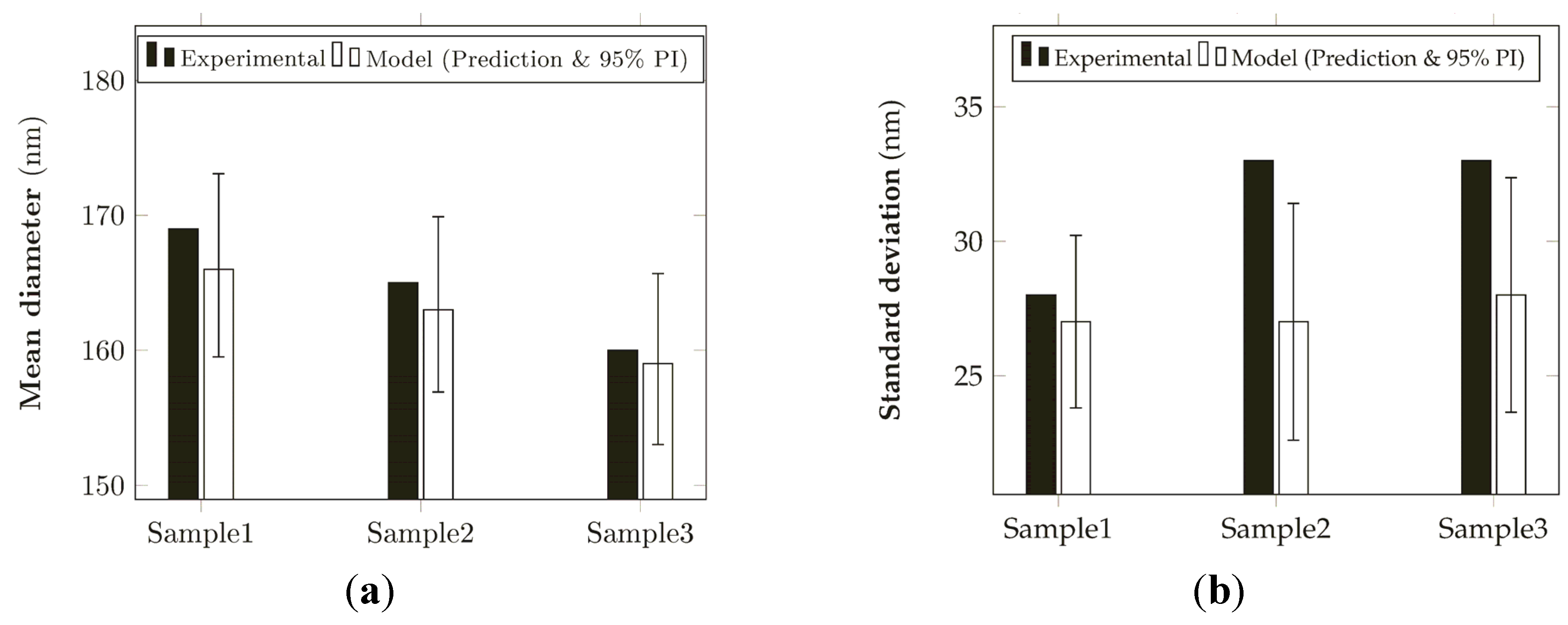 Comparison between the experimental results and the model prediction (prediction and 95% prediction interval) for: (a) the mean diameters and (b) the standard deviation of electrospun nanofibers.