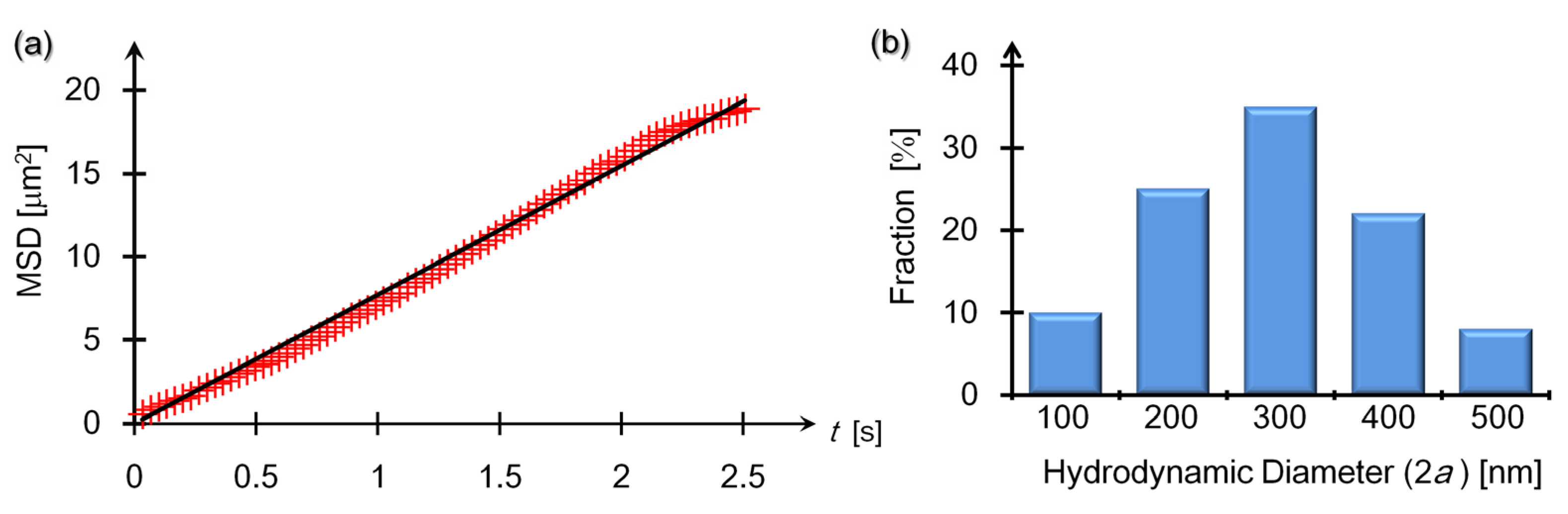 Time-interval (t) dependence of the MSD of a bare SB (a) and histogram representation of the diameter distribution of 50-particles that were recognized as bare SBs (b). (a) The line delineates Equation (1) that was fitted to the measured MSD (red crosses). Error bars lie within symbols. (b) A percentage denotes a mean fraction of 50 particles which depends on a range of hydrodynamic diameter. For example, the label “100” in the transverse axis represents the range 100 ≤ 2a < 200.