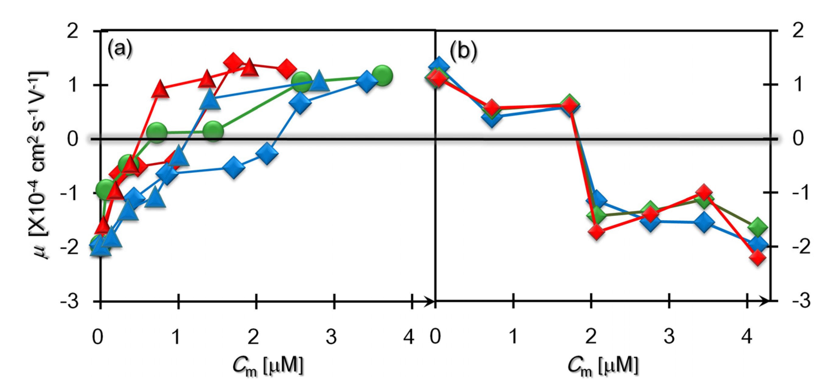 From Figure 2, we can evaluate the isoelectric point, specified by a critical monomer density Ccm, at which μ vanishes due to the electrical neutralizations of the SBs, and beyond which the sign of μ is reversed. Figure 2 provides the different ranges of 0.5 μM < Ccm < 1.2 μM and 1.7 μM < Ccm < 2.4 μM where neutral and basic solvents were used, respectively. Meanwhile, it should be noted that, as observed in Table 1, the zeta potential increases with an increase in pH, arising from the difference of μ at Cm = 0 μM in Figure 2, which indicates that the SBs carry more negative charges in the basic solvents than in neutral solutions. Combining these results, we can ascribe this delay of the charge reversals with the increase of pH to the increasing number of anions adsorbed onto the SB surfaces.