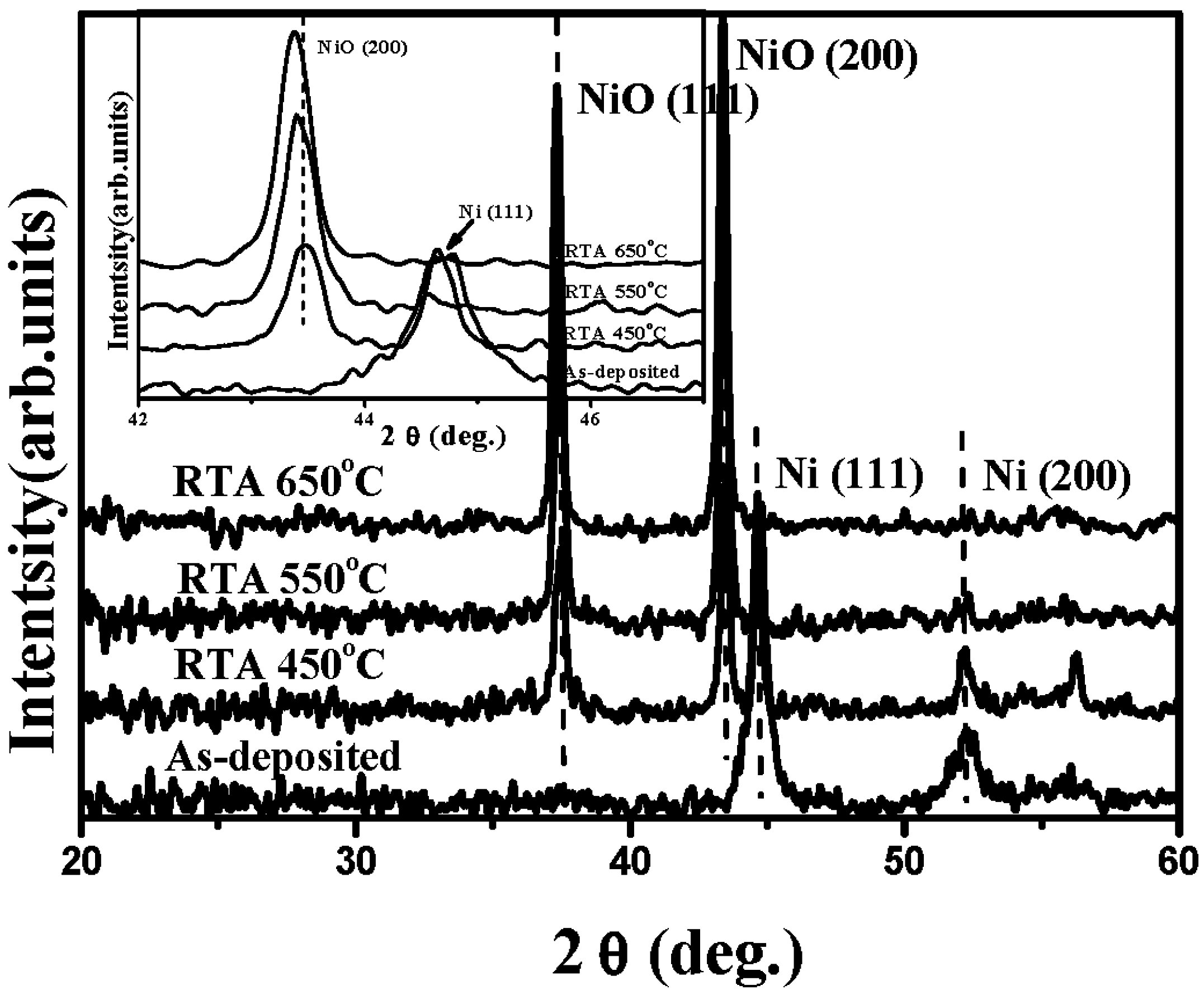- Yang, J.L.; Lai, Y.S.; Chen, J.S. Effect of heat treatment on the properties of non-stoichiometric p-type nickel oxide films deposited by reactive sputtering. Thin Solid Films 2005, 488, 242–246. [Google Scholar] [CrossRef]