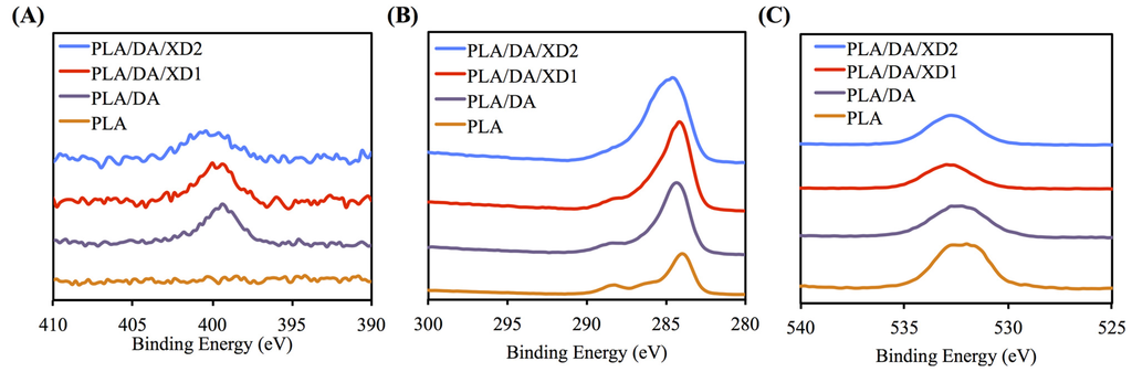 XPS (A) N1s; (B) C1s; and (C) O1s high-resolution spectra obtained on PLA scaffolds after coating with dopamine.