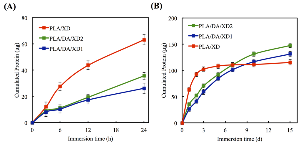 Release profile of XD from PLA scaffolds in DMEM for (A) short and (B) long times. The values shown are means ± standard errors for all the assays.
