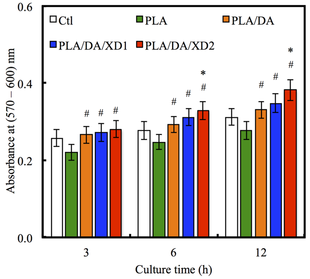 The increase in cell adhesion may be directly related to the improvement of surface hydrophilicity [43] and functional groups (e.g. OH−, NH2−) [18]. To consider the effects of XD and PDA on cell proliferation of hBMSCs, various groups were evaluated at different time-points (Figure 8A). The result shows the proliferation of hBMSCs on all PDA-coated PLA scaffold was significantly higher than PLA (p < 0.05) at all culture time-points. The proliferation rate of hBMSCs gradually increased along with the amount of XD on PDA-coated PLA that indicated a significant difference compared with PDA-coated PLA specimens (p < 0.05). For example, XD2 showed an increase of approximately 16.1% and 19.2% compared to PLA/DA on day 3 and 7. The number of hBMSCs on XD1 and XD2 was even higher than that seen on Ctl, the standard cell culture vessel material. To evaluate the cytotoxic effect of the different specimens, the amount of LDH released to hBMSCs cultured on the presence of the different scaffolds was determined after 1, 3 and 7 days (Figure 8B). The results for the DA and XD coated scaffolds indicated that no cytotoxic agent was released. It suggesting higher cell viability and better biocompatibility for DA and XD coated scaffolds.