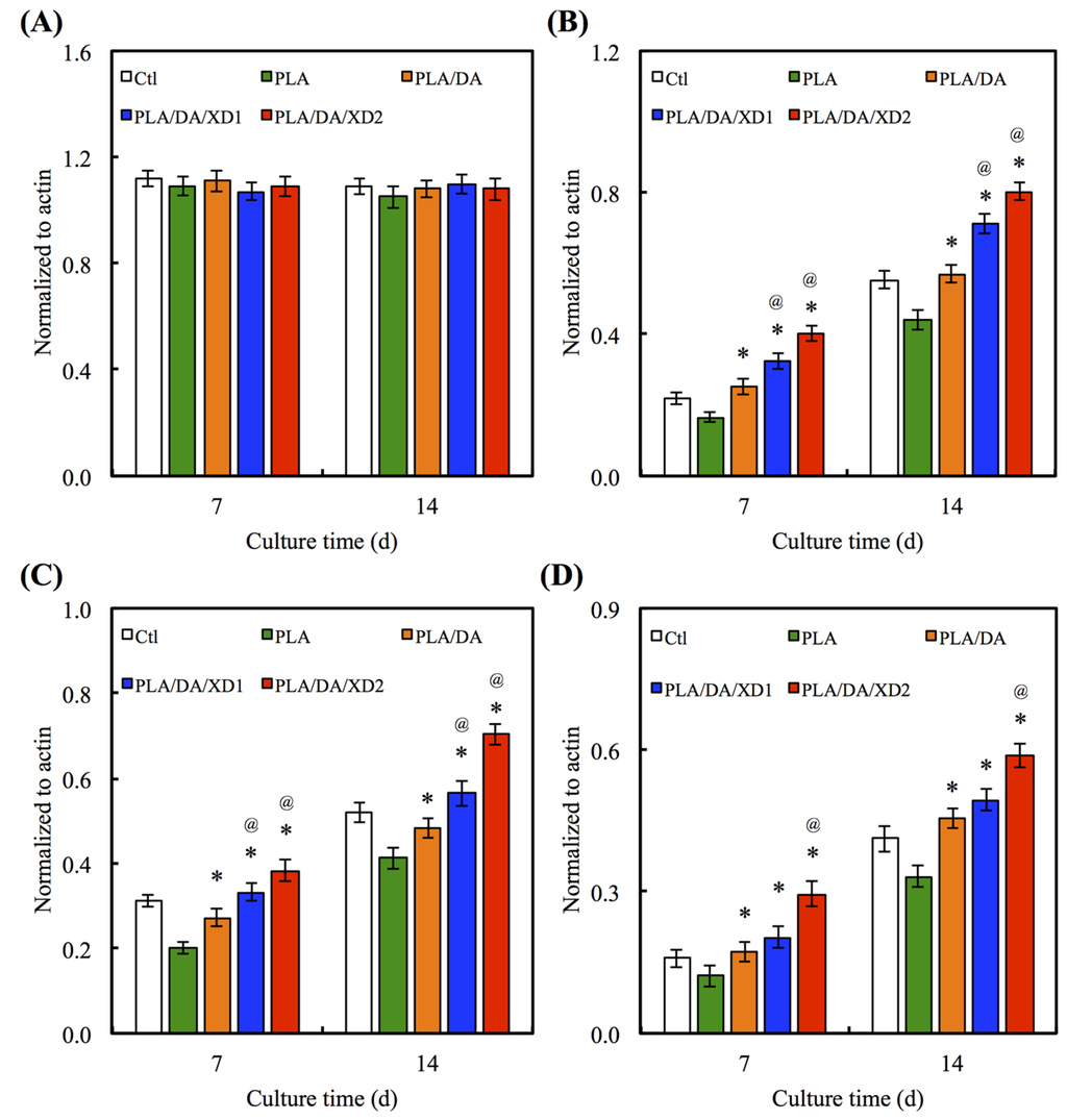There is no obvious difference for the Col gene expression between all specimens at day 7 and 14 (Figure 9A). However, the bone-related gene expression for ALP, BSP and OC of hBMSCs on PLA/PDA/XD1 and PLA/PDA/XD2 are obviously higher than on specimens without XD (Figure 9B–D). Interesting, the expression of ALP, BSP and OC of cells on PLA/PDA/XD2 elicited a significant (p < 0.05) increase of 17%, 25%, and 20% compared with PLA/PDA/XD1 on day 14. ALP is an early marker of osteogenesis differentiation, and it is generally accepted that an increase in the specific activity of ALP in bone cells reflects a shift to a more differentiated state [21]. BSP and OC are later makers of osteogenic differentiation.