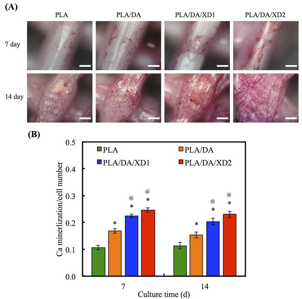 (A) Alizarin Red S staining and (B) quantification of calcium mineral deposits of hBMSCs cultured on various scaffolds for 7 and 14 days. The values shown are means ± standard errors for all the assays. “*” indicates a significant difference (p < 0.05) compared to PLA; “@” indicates a significant difference (p < 0.05) compared to PLA/DA.