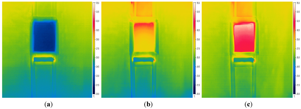 Prior to conducting the thermography to the specimens, thermal emissivity is measured by an isolating tape in accordance with the Fokaides et al. test [36], getting a value of 0.94–0.96. The cabinet average warming period, before starting measuring, is 150 min. Figure 2 shows the thermal images of A1 specimen at three points of inspection: first, with a temperature of 20 °C; 90 min later, with an average surface temperature of 30 °C; at the end of the test, 170 min later, where the specimen reaches a temperature of 32.6 °C.