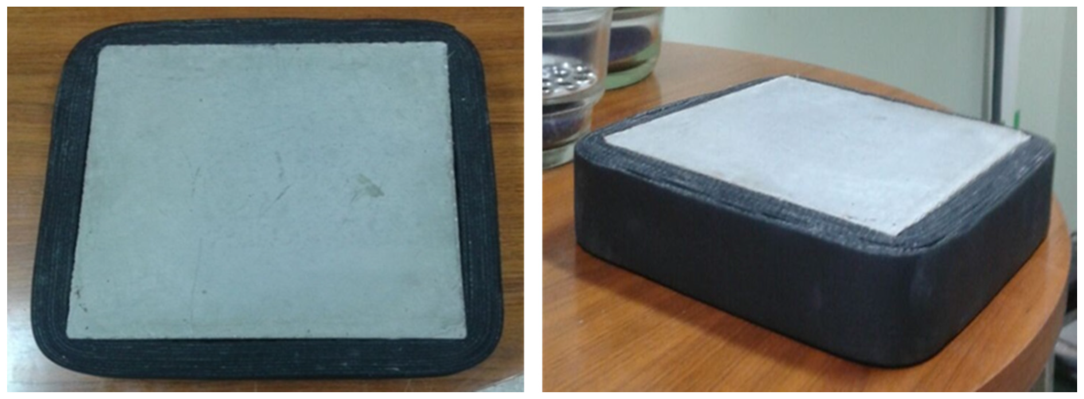 In Table 2, the dosages are taken to each proposed substitution, 0%, 20%, 50% and 100%. The RA has not been pre-wetted before use. The amounts of cement, filler and additive have remained constant, and only the proportions of aggregate have been modified, except for sand 0/2.5, which has remained virtually constant in percentage. The theoretical water/cement (w/c) ratio is 0.45; however, the final ratio is shown in the table, since producing concrete in an automatic concrete mixer, this corrects the amount of water depending on the workability of each kneaded, measuring the moisture with an ammeter. It needs to be considered that with larger amounts of water, a lower initial resistance might be present, lower resistance evolution, higher possibility of quality defects such as shrinkage, carbonation, evaporation, etc. With these dosages, 20 specimens of 25 × 25 × 5 cm3, are done: five per dosage type. The dimensions have been chosen in such a way to evaluate different properties both as infrared thermography and for the study of the thermal conductivity.