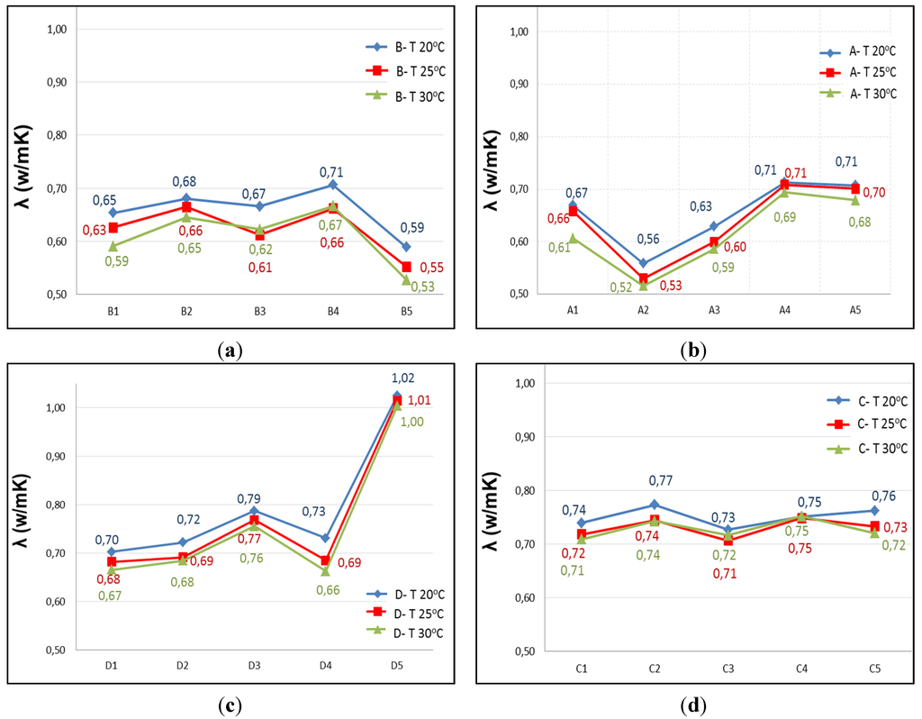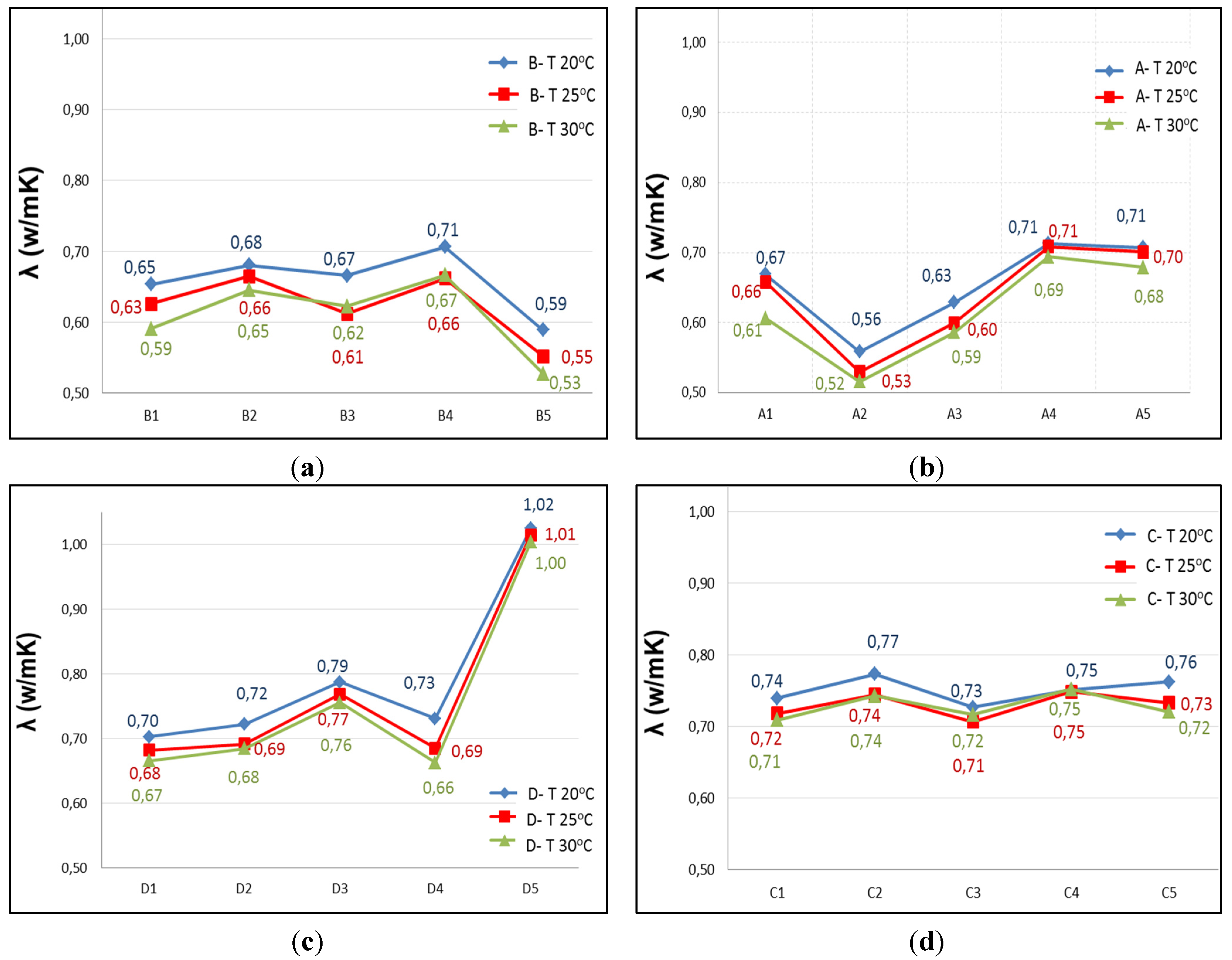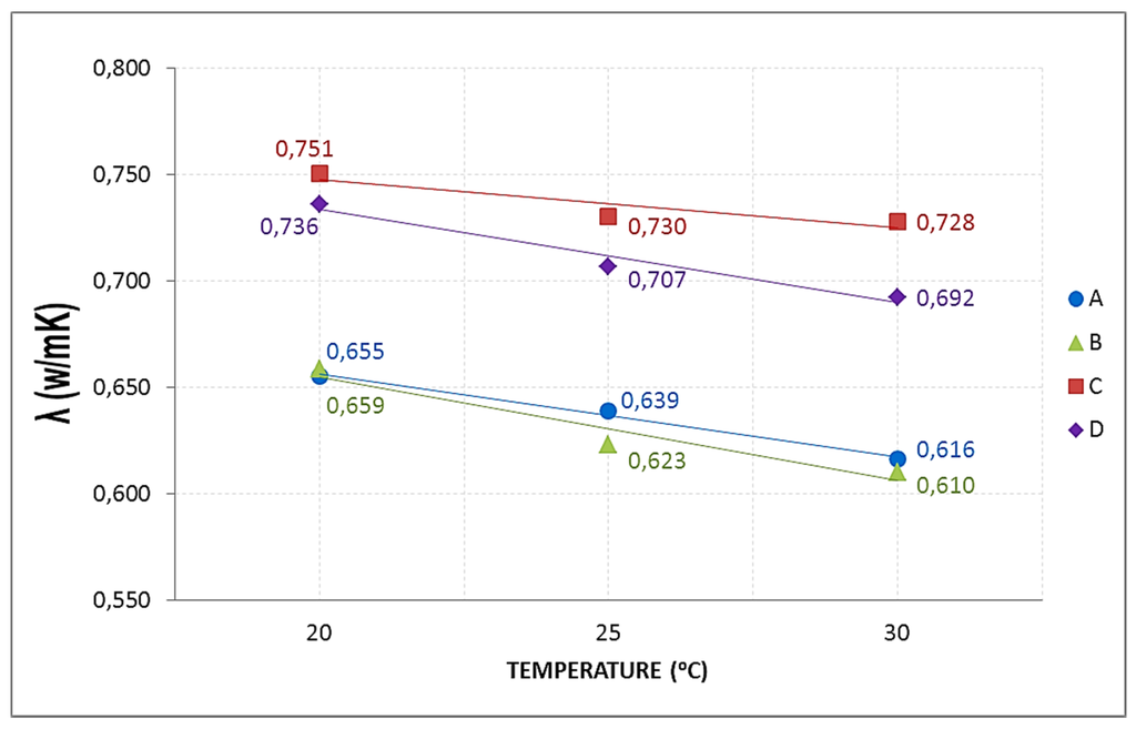 When studying the effect of temperature on the average conductivities, it might be observed that the trend is a linear decrease, i.e., average conductivity decreases when the temperature is increased (Figure 7). All specimens have the same relation, same slope, except for C, whose slope is smaller. For D, B and A, each 5 °C, the average temperature is increased, it means that thermal conductivity decreases by 3.25%. With Group C, the relation is half, which means, per every 5 °C the average temperature is increased, the conductivity decreases by 1.6%. The slope in the line equation is the reason.
