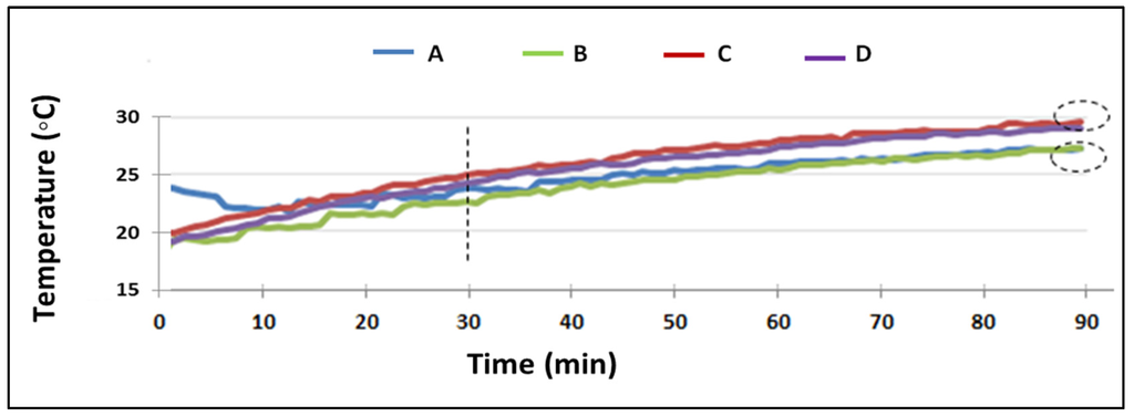 The monitoring of the thermal behavior of 20 specimens with four different RA compositions, at 20 °C, is done creating a quasi-steady temperature difference between the interior, with constant temperature of 50 °C, and as a result, an exterior temperature of 30 °C. The maximum temperature reached by each face of the specimen and the time required to achieve it is analyzed. Through the thermal camera by appropriate software, images are recorded every two minutes, which allows observing the transient heating of each specimen. The average duration of tests is 165 min.