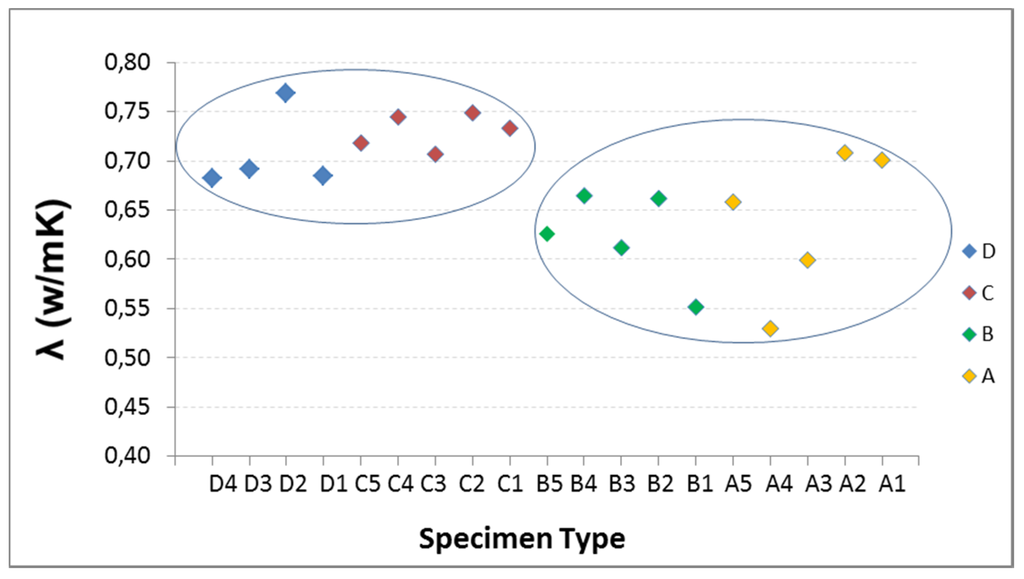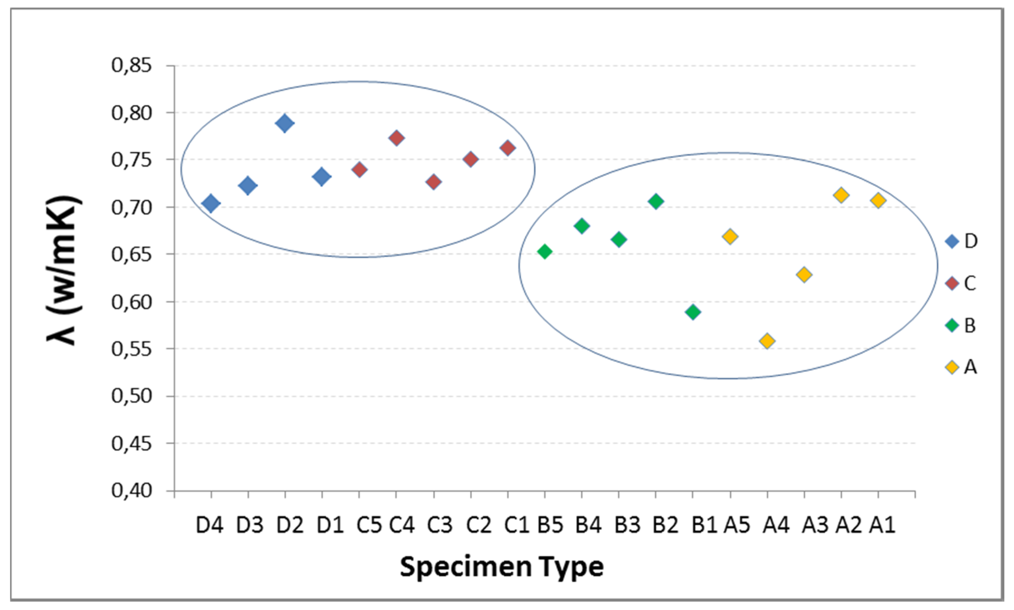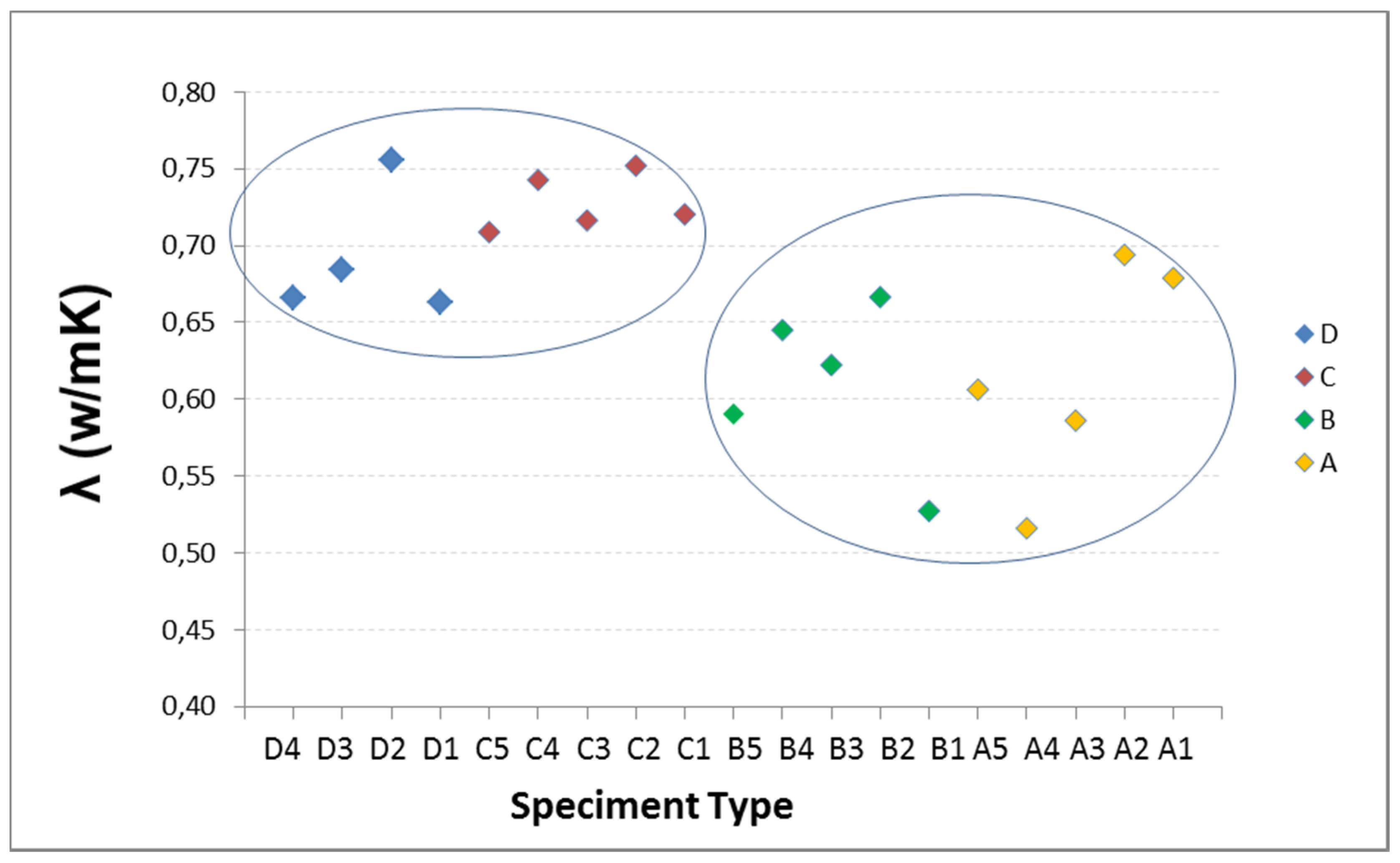 In the D and C groups, the average conductivity of C is slightly higher than of the D type. It may be, on the one hand, because the D5 specimen has been ruled out as an atypical value (Tukey test), the one with the highest conductivity, which makes that the average conductivity considerably reduced; in C, the conductivity is the average of the five samples. On the other hand, the composition of the mixtures is different: the C specimens have a higher content of natural super-fine aggregate size 0/2.5 mm, 44% of the total aggregate compared with 40% for D; a factor that can influence on conductivity, increasing slightly the conductivity of C with respect to the D.