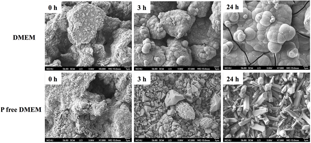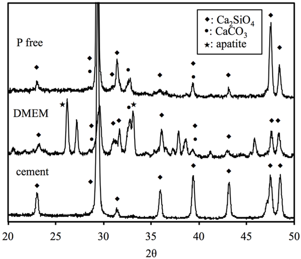 To evaluate the in vitro bioactivity of the specimens, they were immersed in a 10 mL normal Dulbecco’s modified Eagle’s medium (DMEM) and phosphate-free DMEM (P-free DMEM) at 37 °C. Before soaking in DMEM, all the specimens were sterilized by immersion in 75% ethanol followed by exposure to an ultraviolet (UV) light for 1 h. After soaking for various time durations ranging from 3 to 24 h, the specimens were removed from the tube. The phase composition of the cements was then analyzed using X-ray diffractometry (XRD; Bruker D8 SSS, Karlsruhe, Germany) operated at 30 kV and 30 mA at a scanning speed of 1°/min. The morphology of the cement specimens was then examined under a scanning electron microscope (SEM; JSM-6700F, JEOL, Tokyo, Japan) operated in the lower secondary electron image (LEI) mode at 3 kV acceleration voltage.