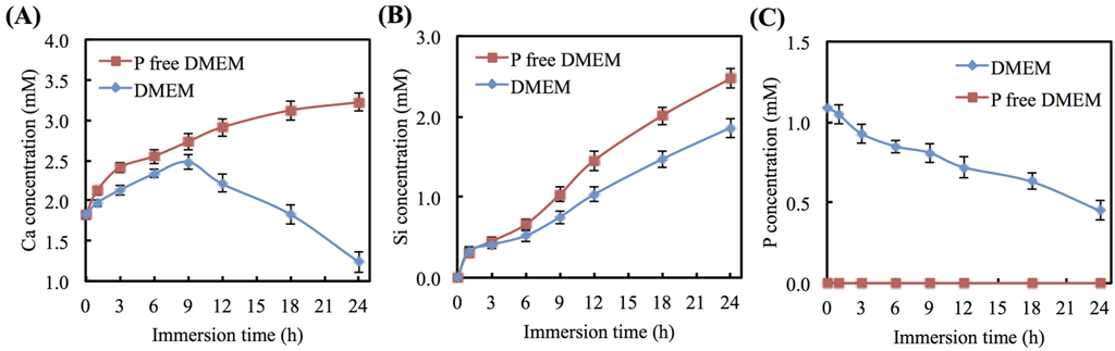 The variations in the different DMEM Ca, Si, and P ion concentrations as measured at different times during the period after immersion are shown in Figure 3. The Ca ion concentration of the medium increased after being cultured for 9 h and then went to levels higher than the baseline Ca concentration of P-free DMEM (2.73 mM) (p < 0.05). A significant difference (p < 0.05) in the Ca ion concentration levels can be seen between P-free DMEM and DMEM after immersion for 9 h (p < 0.05). After 24 h, the Si ion concentration was approximately 2.5 and 1.9 mM at P-free DMEM and DMEM, respectively (Figure 3B). The P ion concentration of DMEM decreased after immersion, and the concentration ended up at approximately 0.45 mM (Figure 3C). There was no P ion detected in the P-free DMEM.