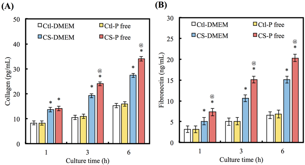 Figure 4. (A) COL and (B) FN were secret from hDPCs after seeding on CS with different DMEM for 1, 3, and 6 h. “*” indicates a significant difference (p < 0.05) compared to same material with DMEM. “@” indicates a significant difference (p < 0.05) compared to Ctl in same medium.