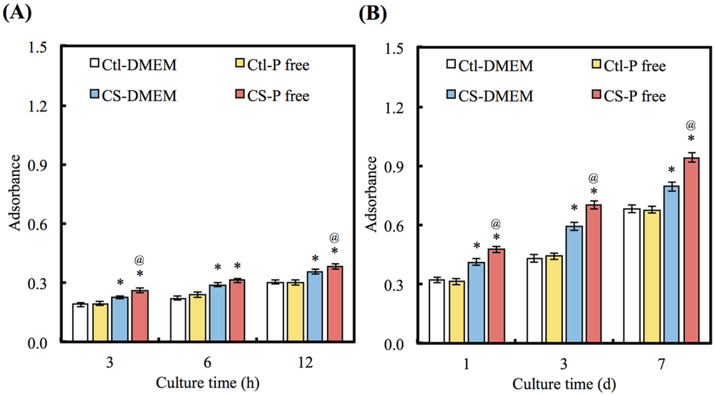 To consider the effects of apatite precipitate on cell adhesion and proliferation, the biological functions of hDPCs cultured on CS with different DMEMs were evaluated after different periods of time (Figure 5A,B). The Ctl group shows no significant differences in the ability of cell adhesion and proliferation (p > 0.05) between DMEM and P-free DMEM for all time points. Interestingly, there is a greater number of cells on the CS with the P-free DMEM than there is on the CS with the DMEM at all time-points (p < 0.05). The number of cells cultured on CS with the P-free DMEM shows an increase of 15%, 18%, and 20% in comparison with the DMEM on days 1, 3, and 7 of cell seeding, respectively.
